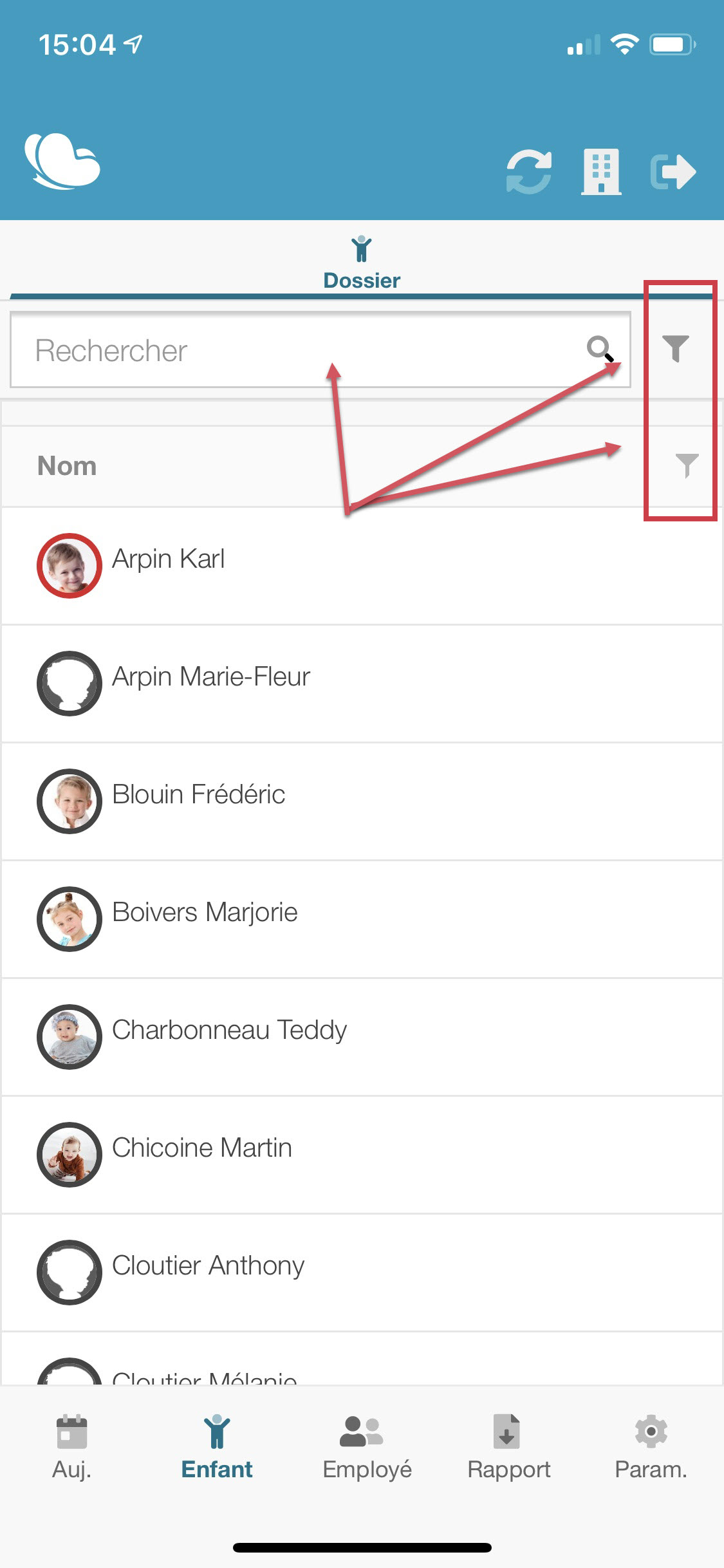 Lorsque vous accédez au dossier des enfants, des employés ou de toute grille permettant d'effectuer des recherches, un entonnoir