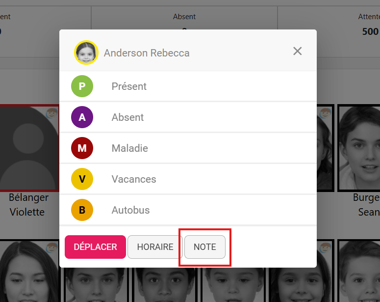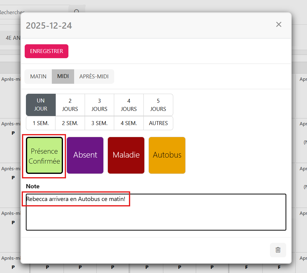 Il est possible d'ajouter une note qui apparaîtra dans le suivi de présence sur la version mobile.