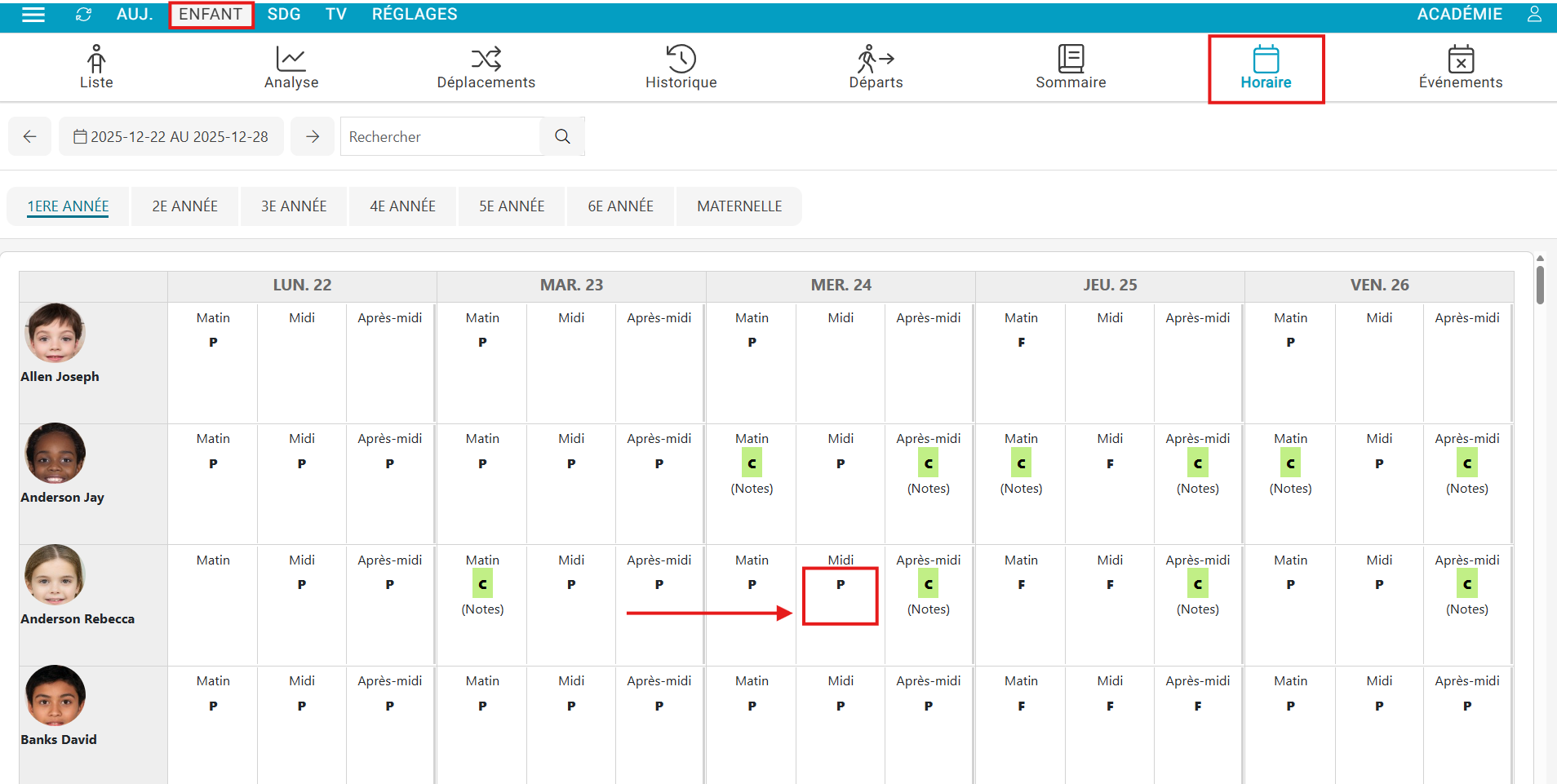 - Positionnez-vous sur la bonne journée, sur le bon enfant et sélectionner la case à modifier;