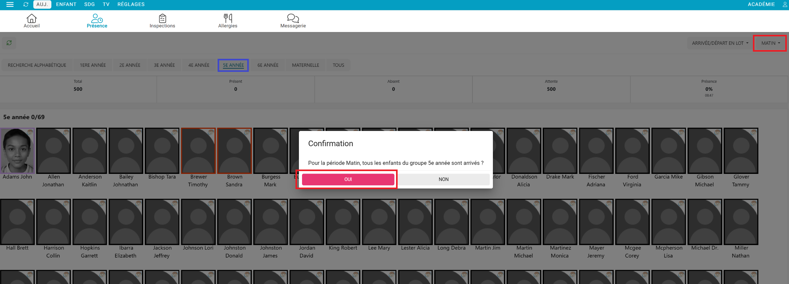 En cliquant sur "Arrivée en lot", le message contenant vos paramètres apparaisse, vous permettant de valider ce qui sera appliqué. Dans mon exemple, le message "Pour la période "Matin", tous les enfants du groupe "5 année" sont arrivés?" m'indique que, si je réponds OUI, l'application mettra présent tous les enfants du groupe de 5e année seulement.