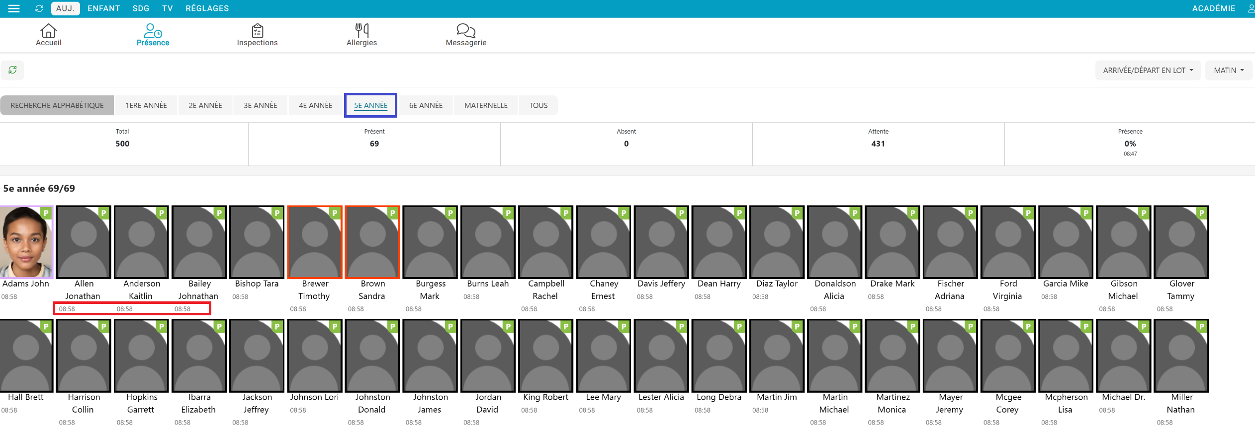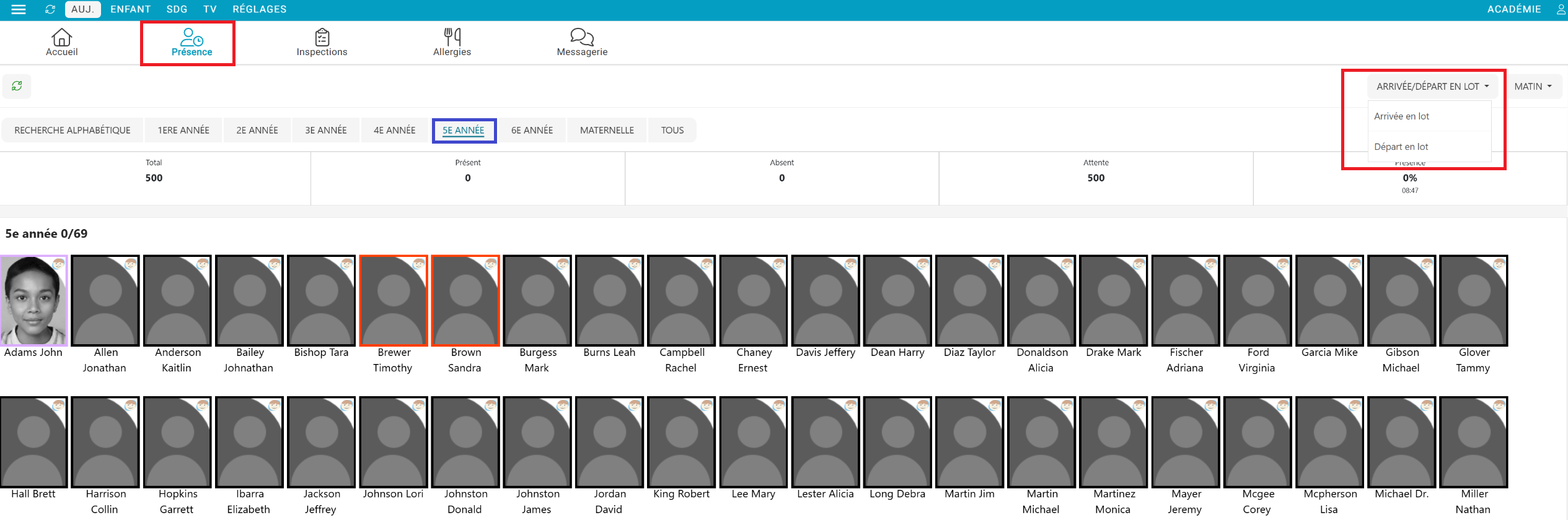 Vous pouvez donc sélectionner le groupe d'enfant à faire arriver ou quitter en même temps. Dans mon exemple : J'ai sélectionné la période du matin et le groupe des 5e année :