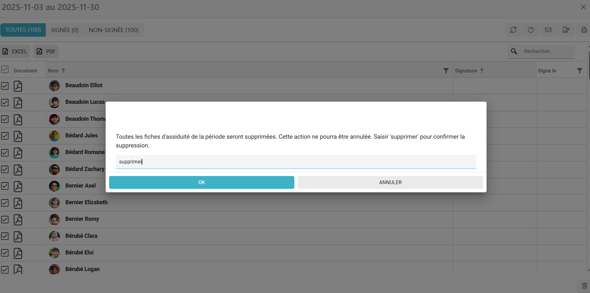 Les signatures existantes associées à cette période de fiche d'assiduité seront aussi supprimées.