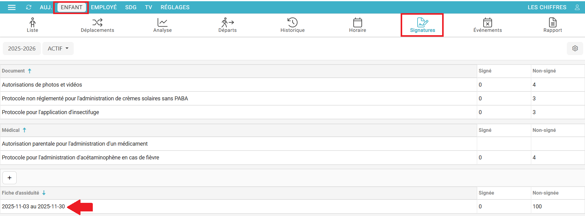 - Rendez-vous dans le menu "Enfants- Signatures";