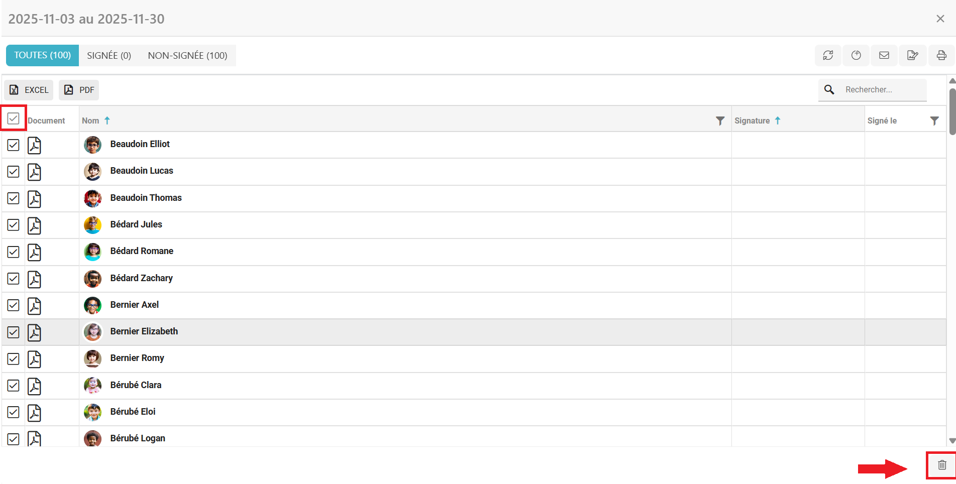 2- Sélectionner la période de fiche d'assiduité que vous voulez supprimer;3- Cliquer sur l'icône de la petite poubelle situé dans le coin inférieur droit