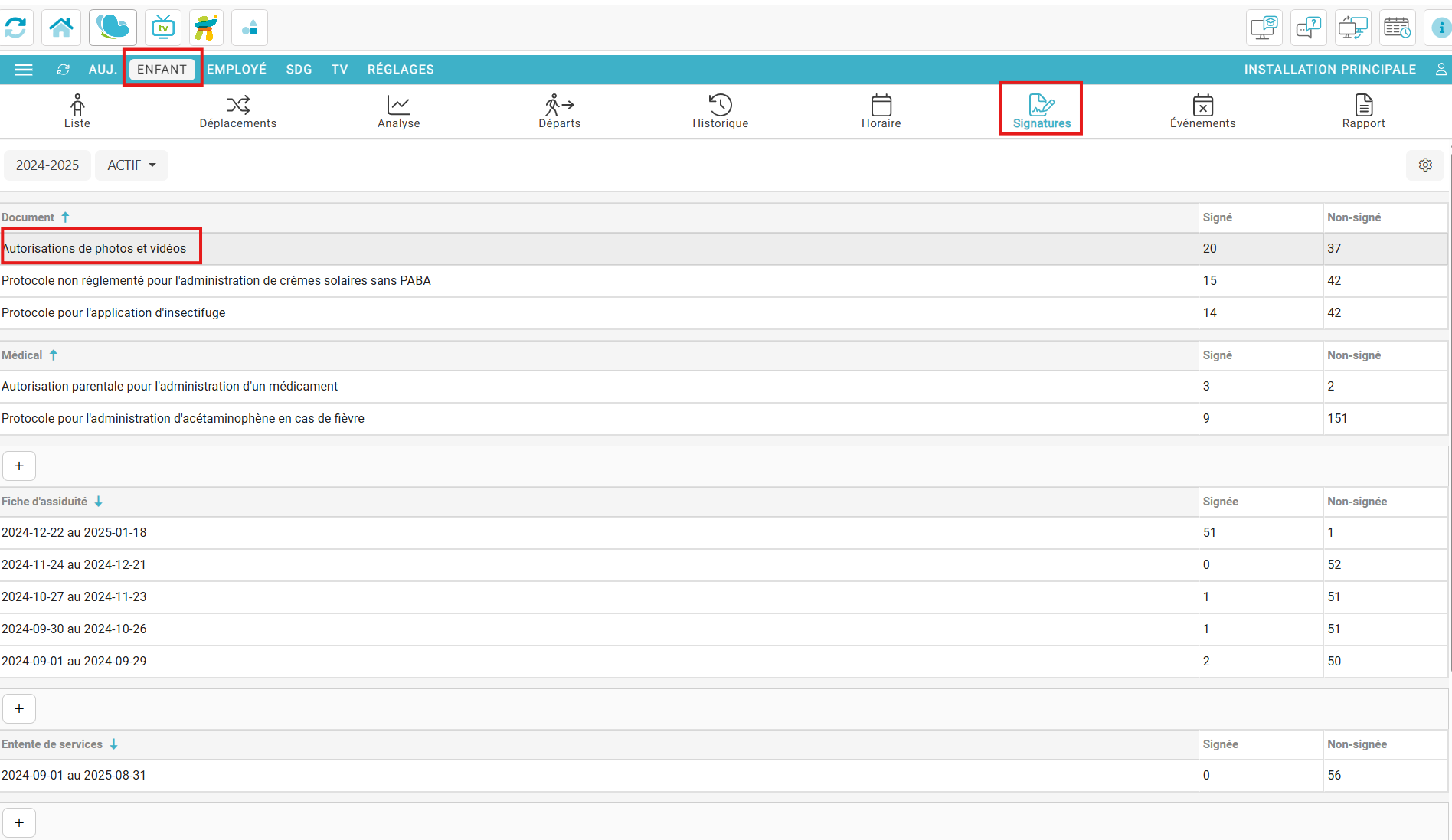 Par la suite, vous trouverez le document dans l'onglet "Enfant", menu "Signatures", section "Autorisations de photos et vidéos" :
