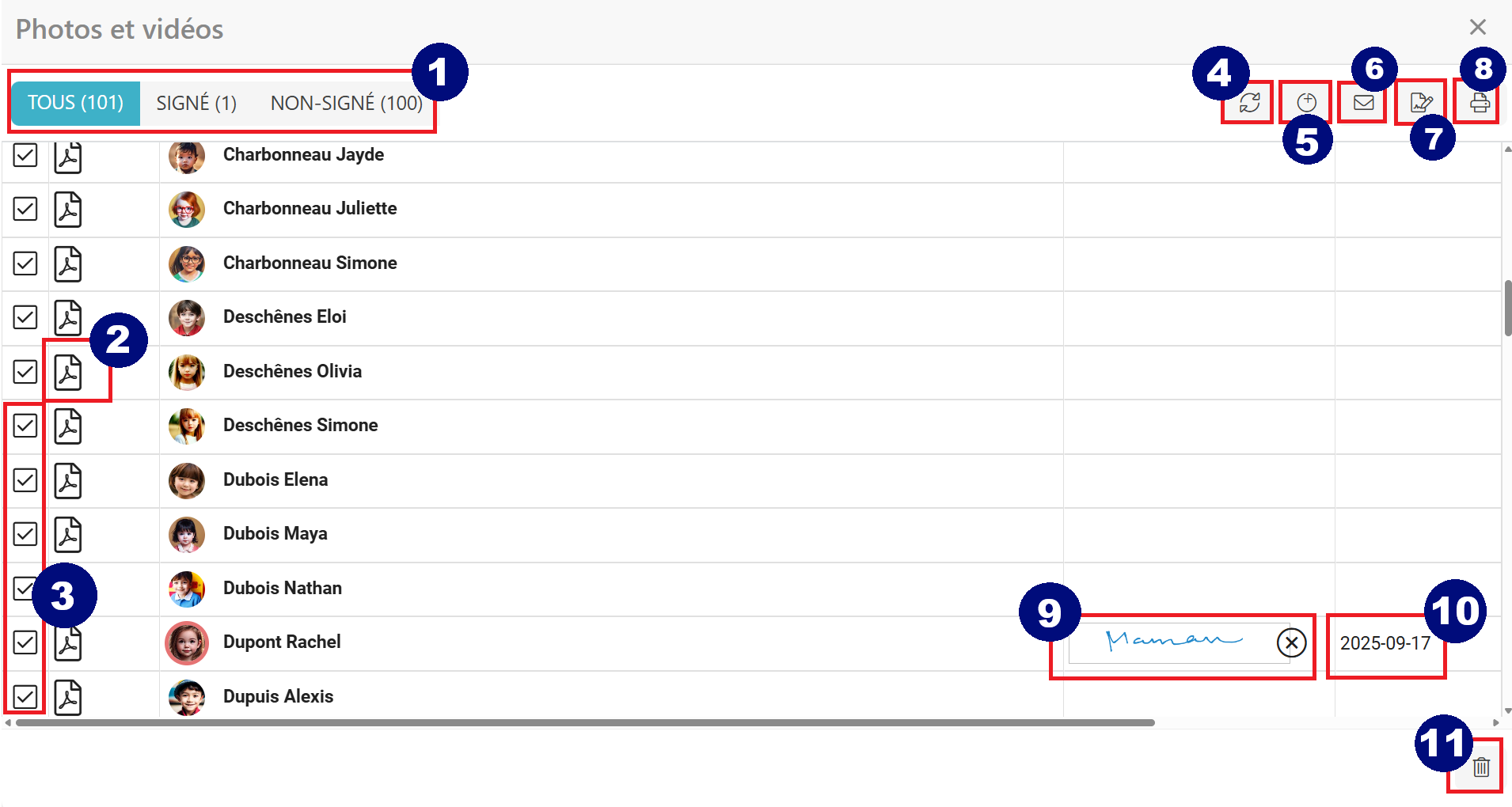 Une fois le document d'autorisation de photos et vidéos envoyé aux parents, ces derniers auront la possibilité de cocher les cases qui s'y trouvent et d'apposer leur signature.