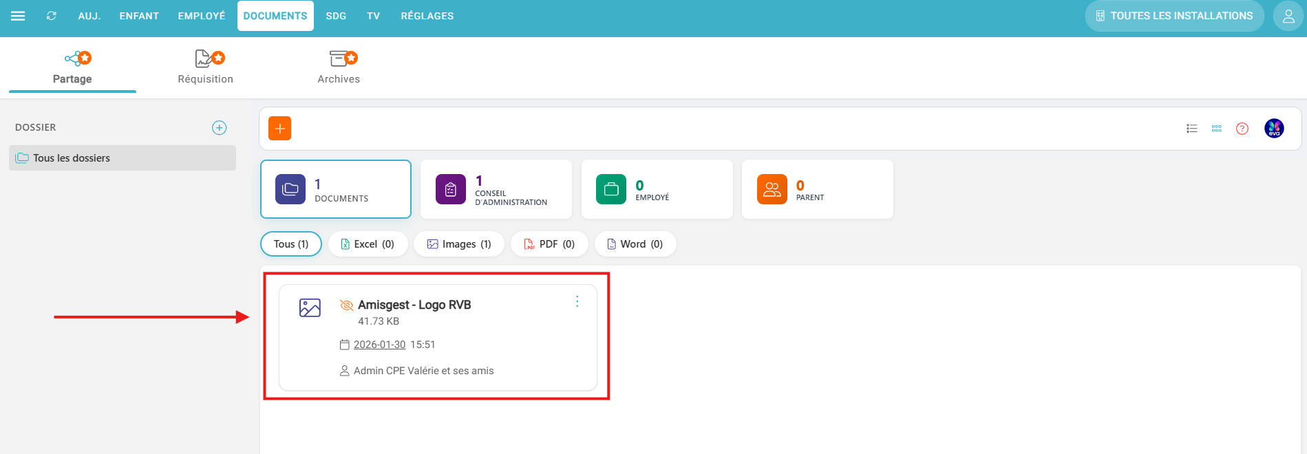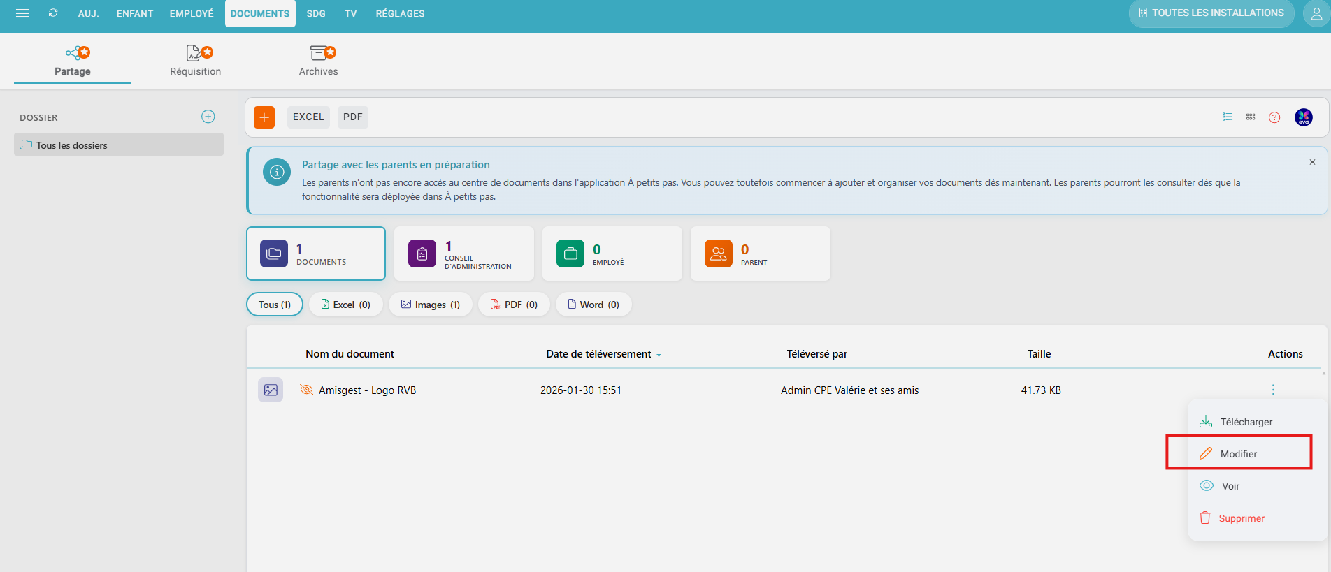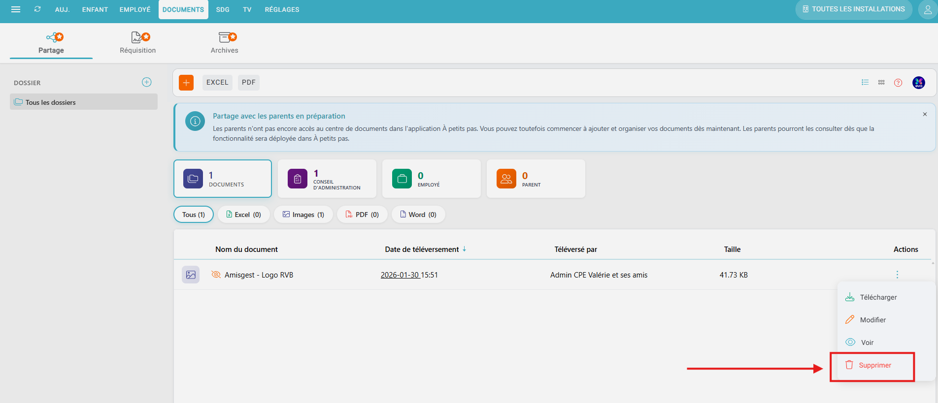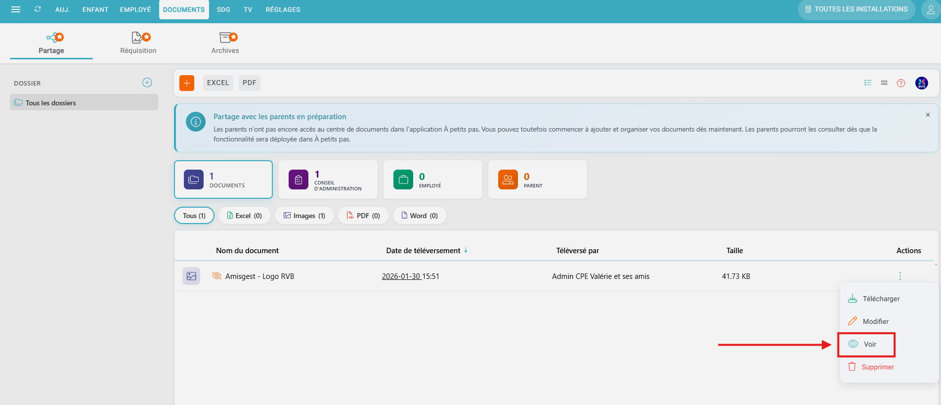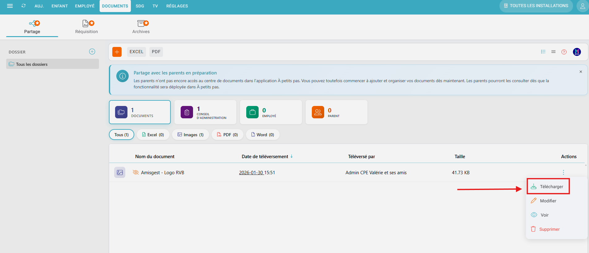 - Types de document: Choisissez à quel(s) type(s) de personne vous souhaitez partager le document en question (Conseil d'administration, Employé, Parent).