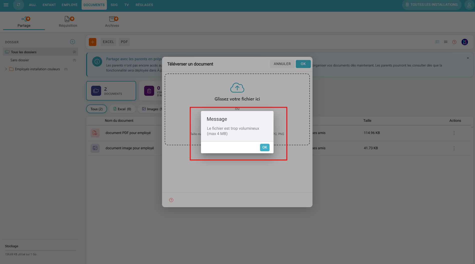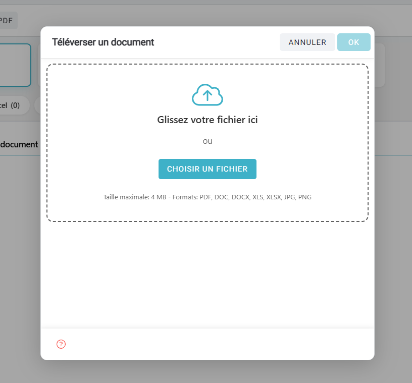 NB : Tel qu'indiqué dans l'encadré, la taille maximale de fichier pouvant être déposé dans le centre de documents est de 4MB. Si vous tentez de déposer un fichier plus volumineux, le système ne permettra pas le téléversement et vous l'indiquera.