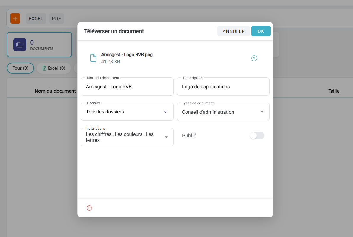 - Installations: Choisissez la ou les installations concernées par le document pour permettre un classement optimal.