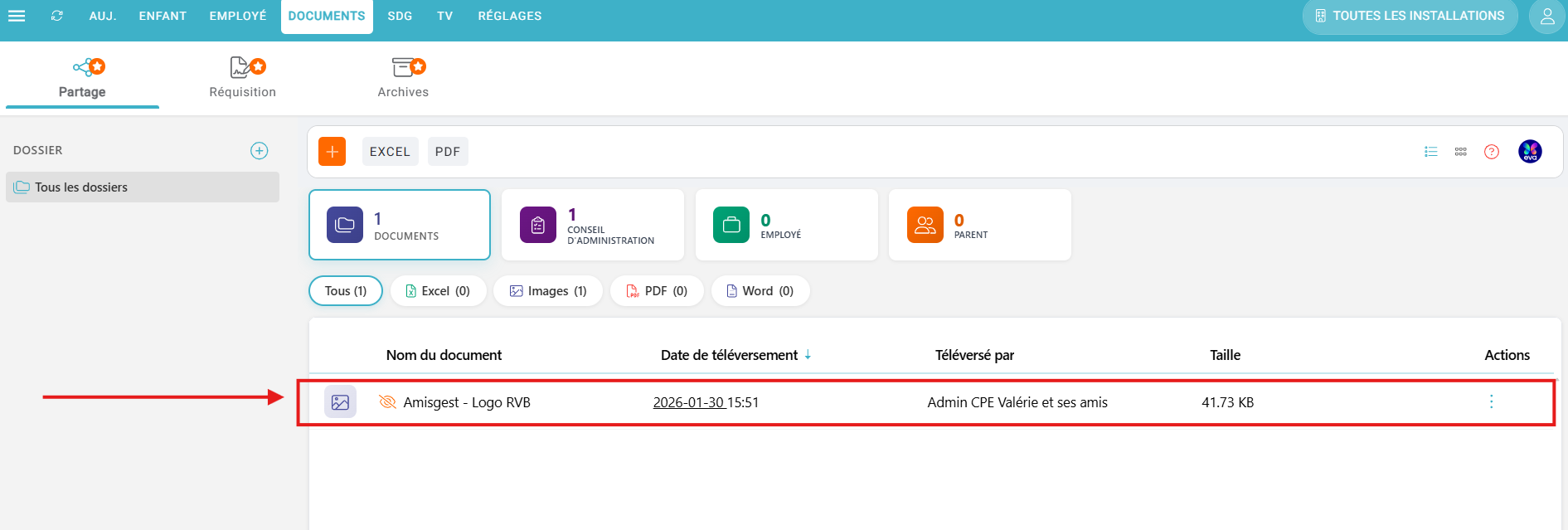 Le fichier figurera ensuite dans la liste de documents en fonction de ce qui aura été sélectionné: