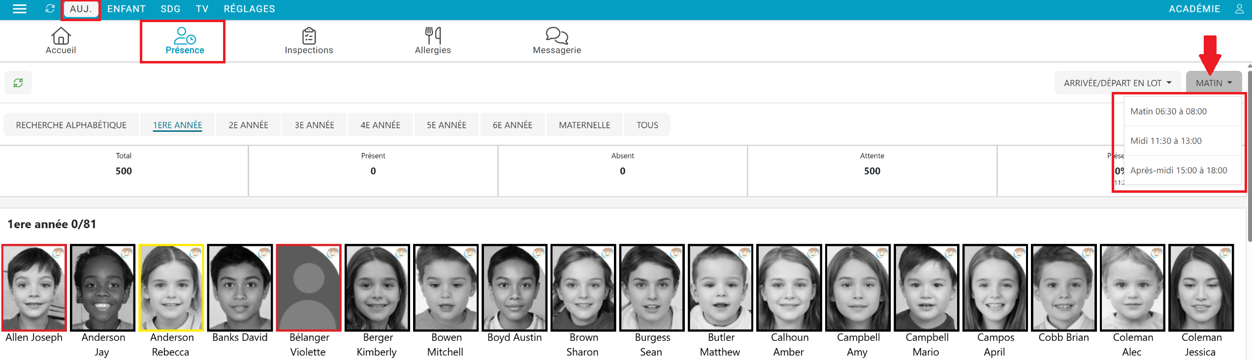 En cliquant sur la période désirée, les élèves prévues pour cette période de service de garde apparaîtront à l'écran, vous permettant de prendre les présences de ceux-ci.