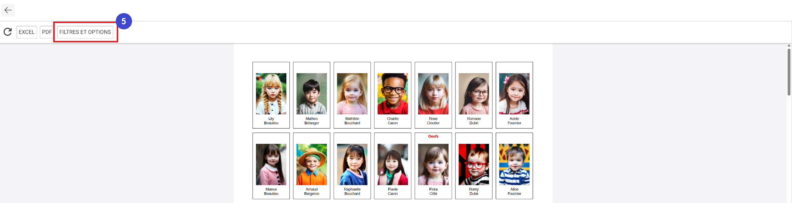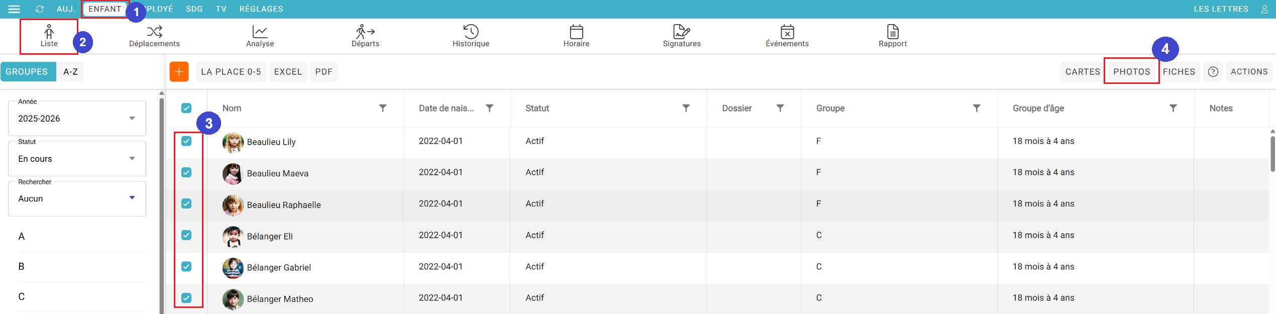 NOTE : Si vous souhaitez imprimer d'avance les photos d'enfants qui n'ont pas encore débuté leur fréquentation, assurez-vous de sélectionner le filtre À venir