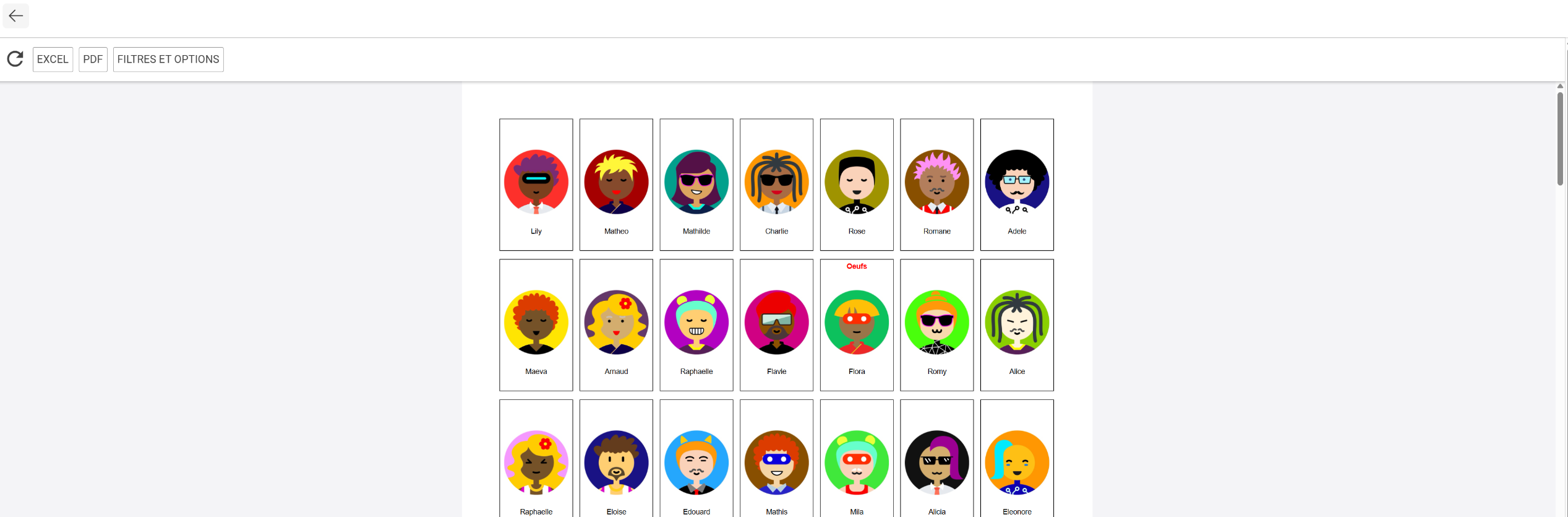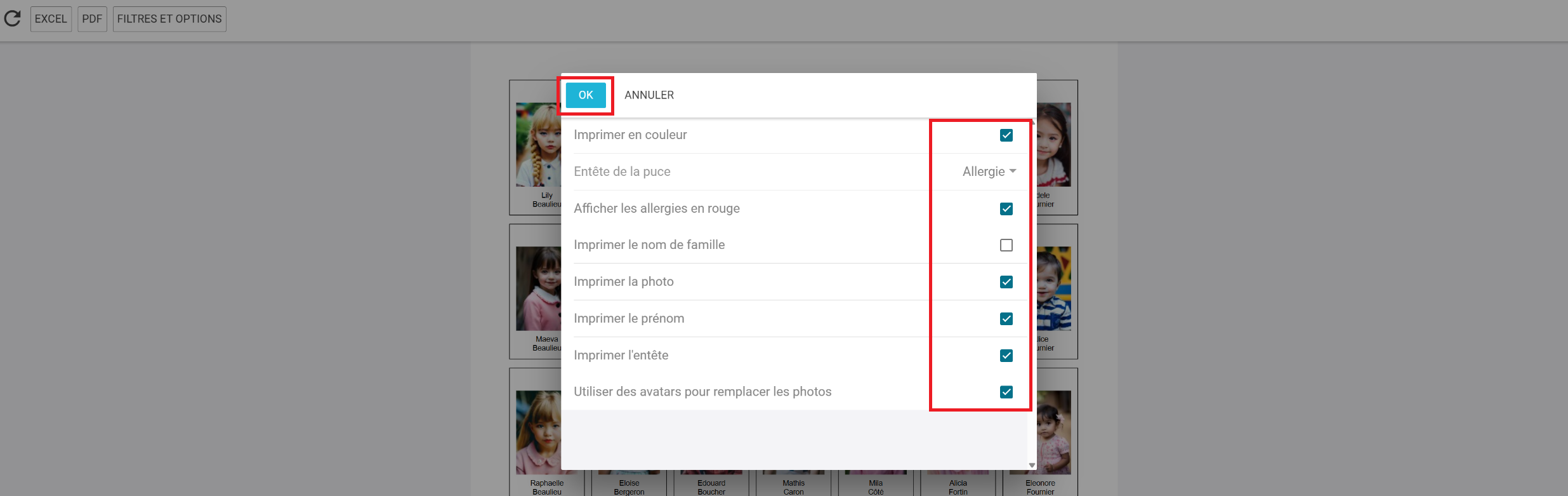 Une option permet de générer un avatar pour remplacer la photo de l'enfant. Voici les éléments à sélectionner pour éviter d'imprimer la photo de l'enfant.