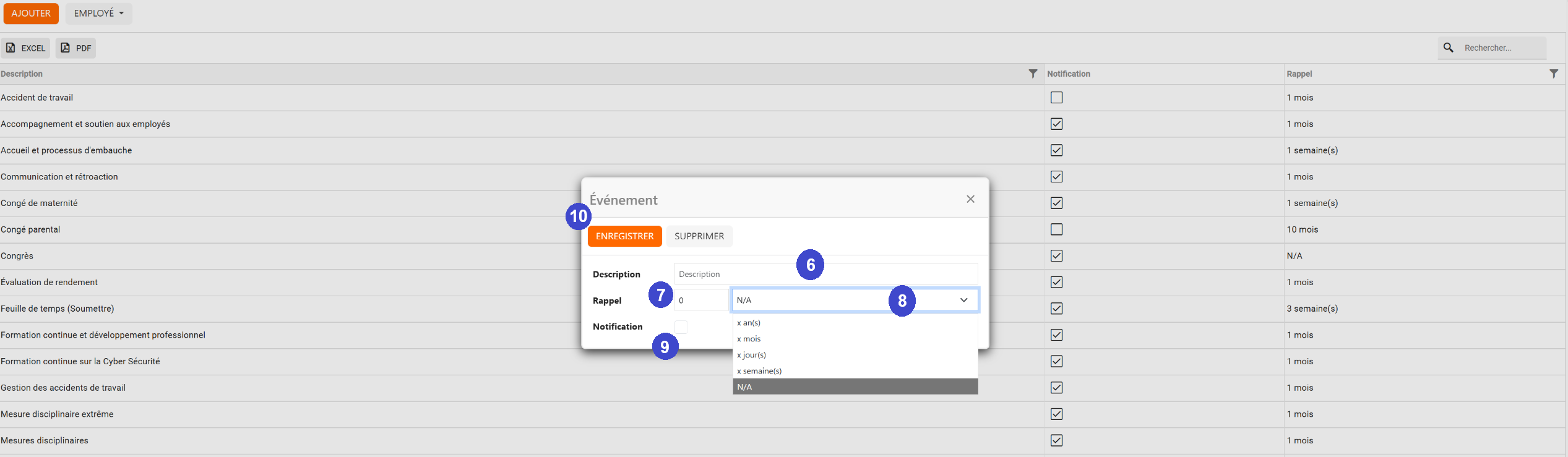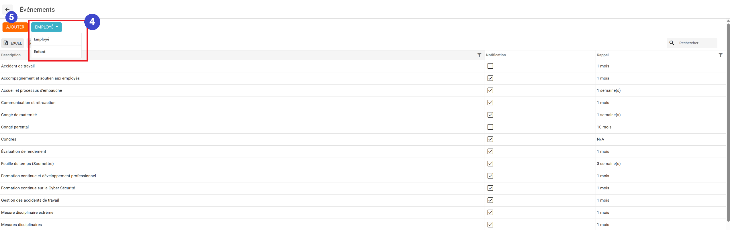 5- Cliquer sur le bouton "+AJOUTER" pour ajouter un nouvel événement aux Employés dans la liste;