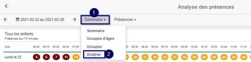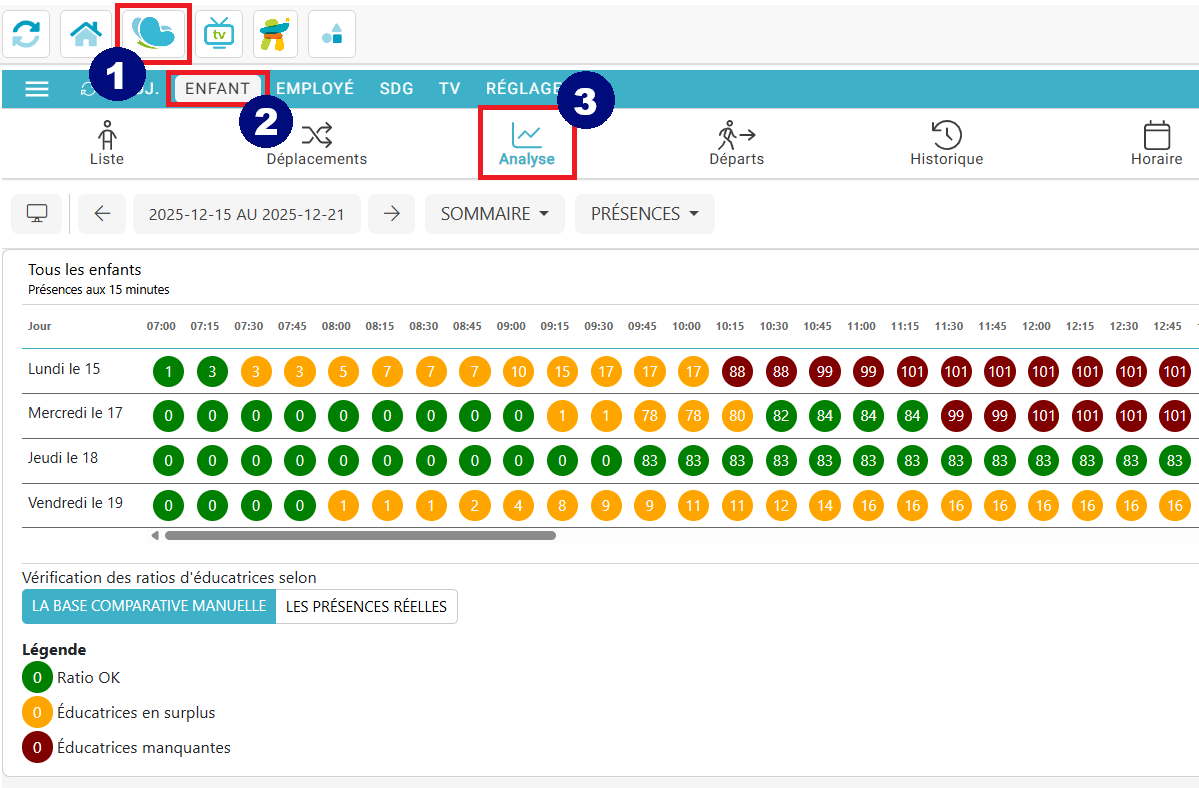 9. Les chiffres mentionnent le nombre d'enfants présent aux 15 minutes. Si vous cliquez sur le chiffre, vous serez en mesure de savoir quels sont les