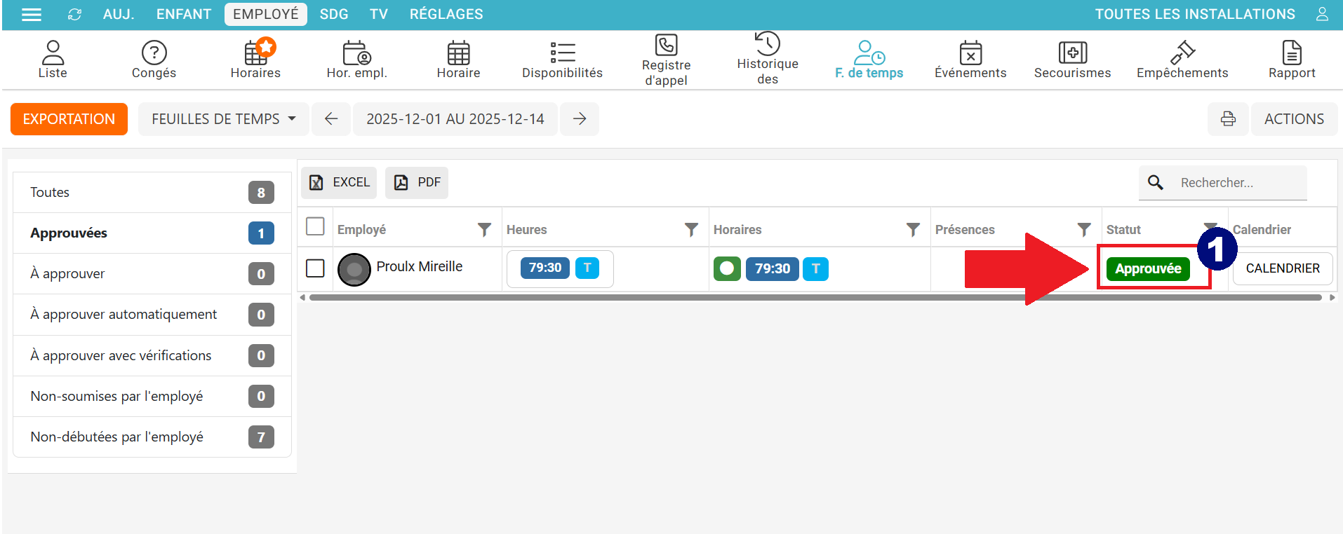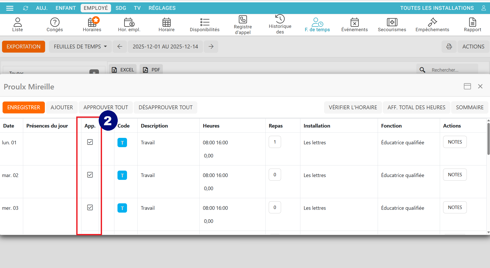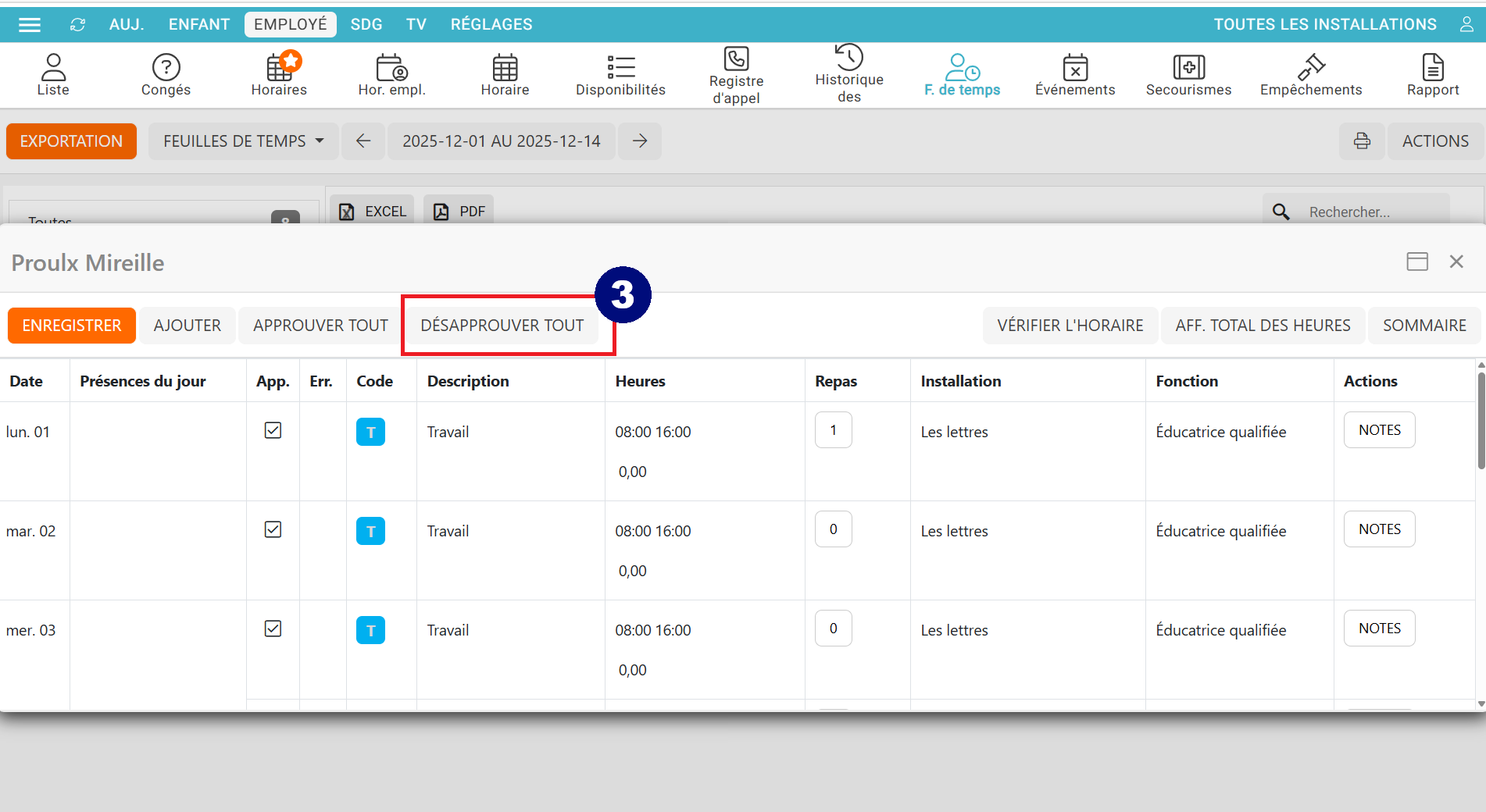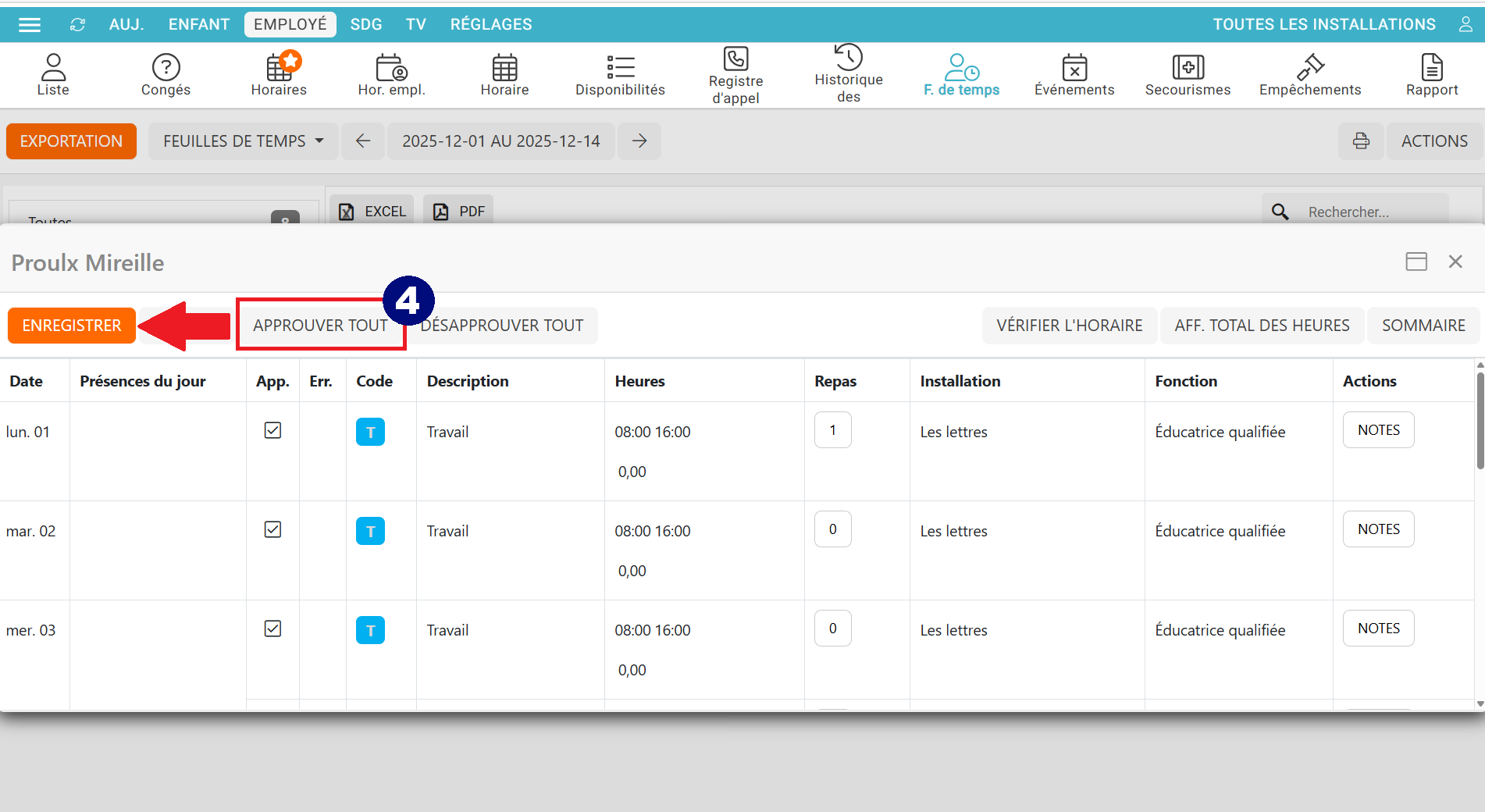 Approuver tout", puis sur "Enregistrer" afin d'enregistrer la modification et la feuille de temps reviendra au statut "