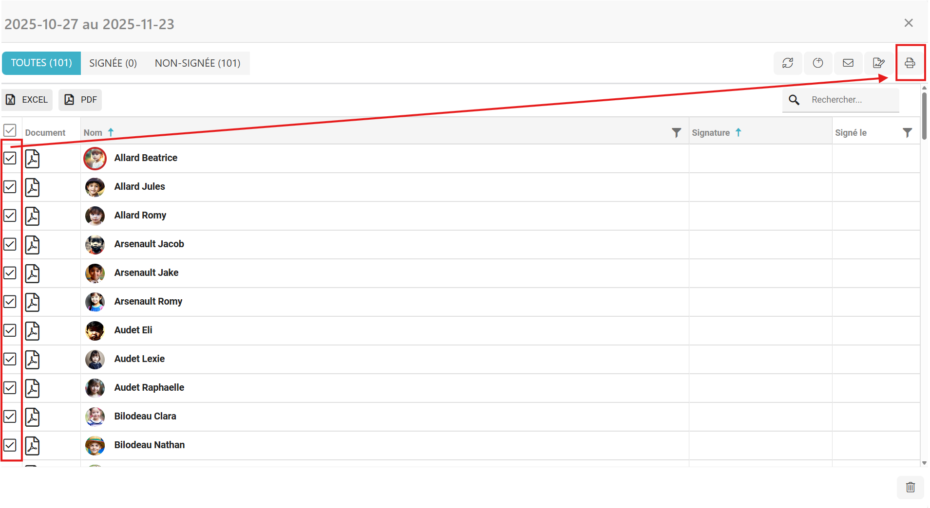Cochez la ou les cases correspondant à la ou les fiches d'assiduité que vous souhaitez imprimer. Cliquez sur l'option d'impression dans le coin supérieur droit de la fenêtre :