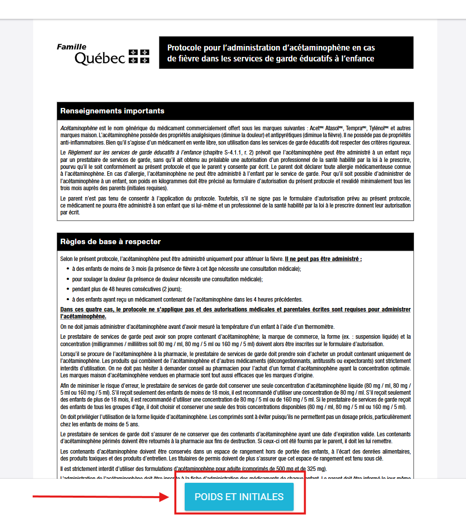 Vous souhaitez conserver la responsabilité de saisie du poids des enfants sur le protocole d'autorisation pour l'administration de l'acétaminophène?