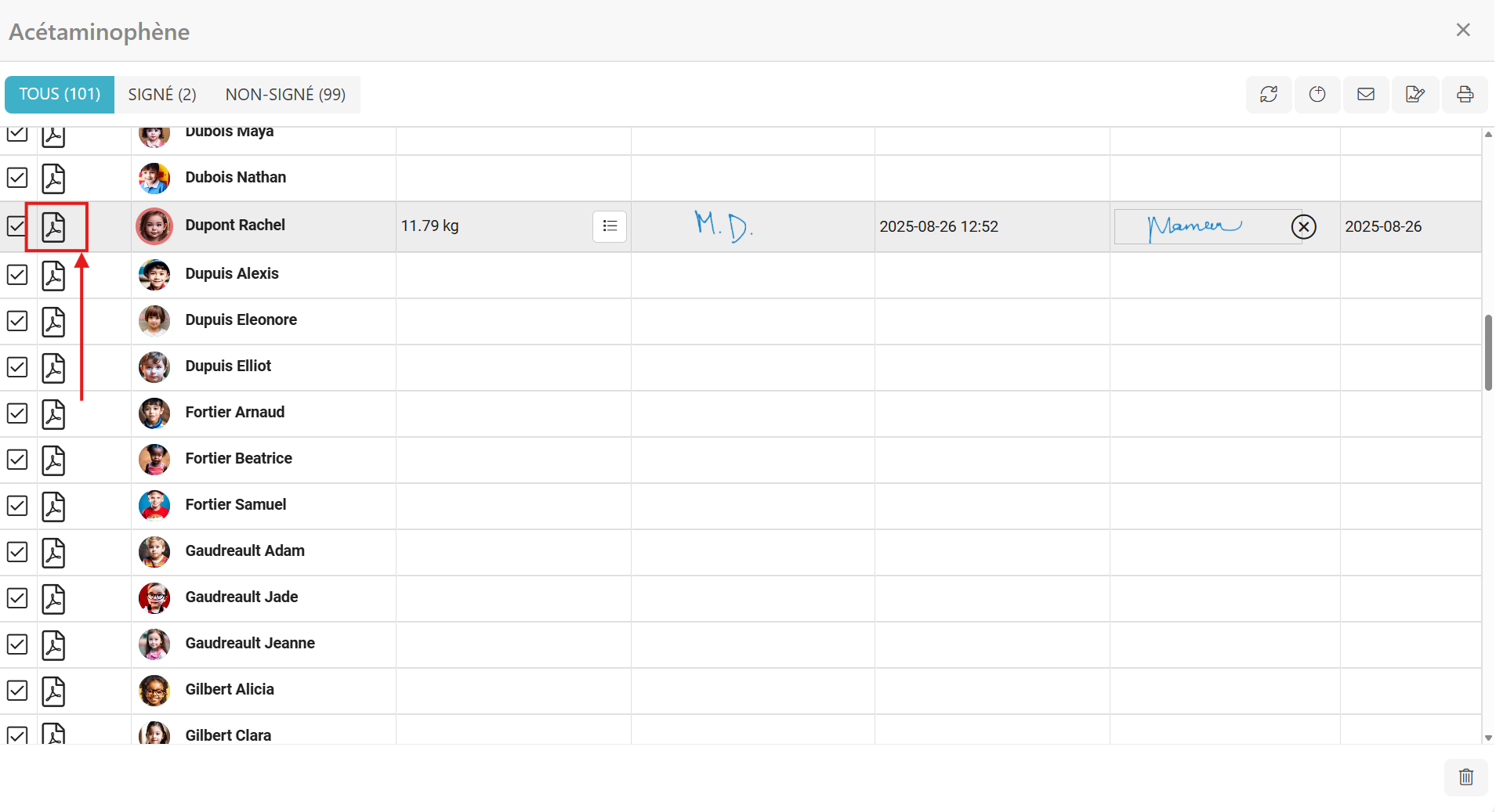 2. Une fois dans la liste des documents, cliquez sur le fichier PDF rattaché à l'enfant pour qui vous souhaitez ajouter un poids :