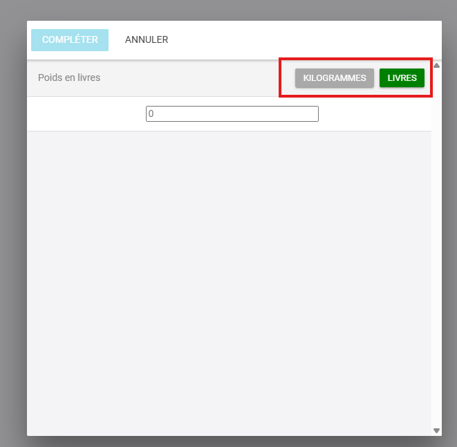 5. Vous pourrez ainsi saisir le poids en livre ou en kilos. *La conversion en kilos s'effectuera automatiquement pas la suite si vous saisissez le poids en livres*
