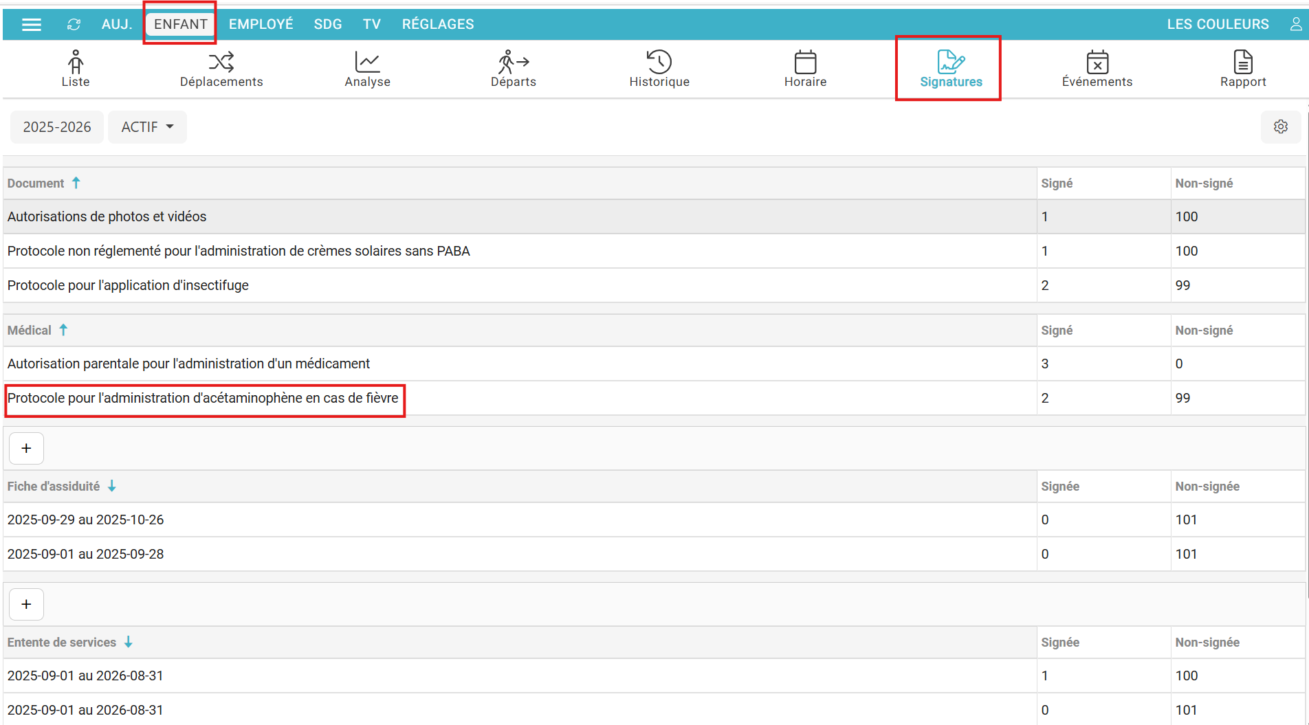 1. Rendez vous dans le menu signatures, depuis l'onglet enfant, puis sélectionnez la section du protocole d'autorisation pour l'administration d'acétaminophène :