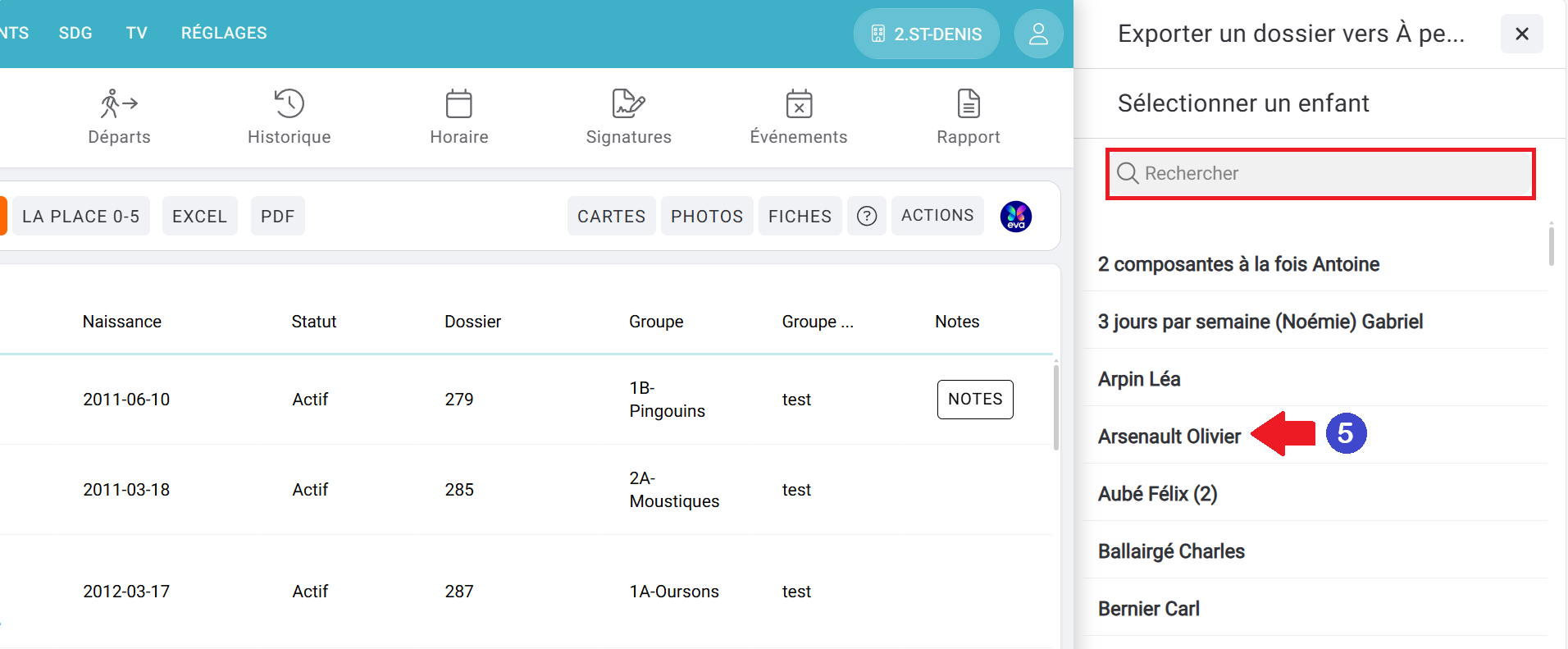 5- Sélectionner le nom de l'enfant dans la liste OU utiliser le champs de recherche pour trouver le nom de l'enfant.