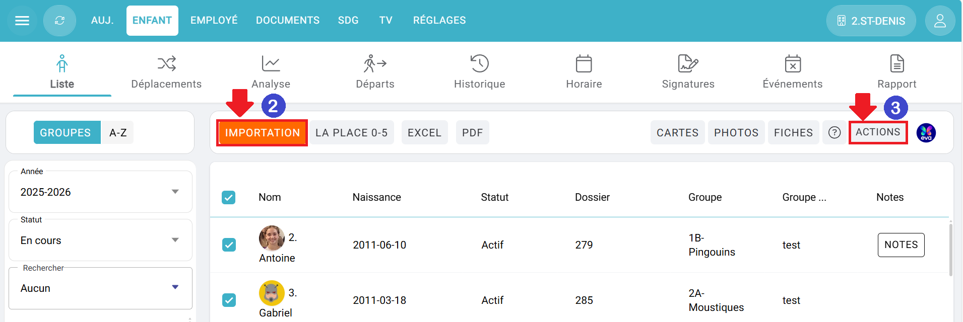 3- Dans SDG+, dans le menu Enfants - Liste, cliquer sur le bouton "ACTIONS".