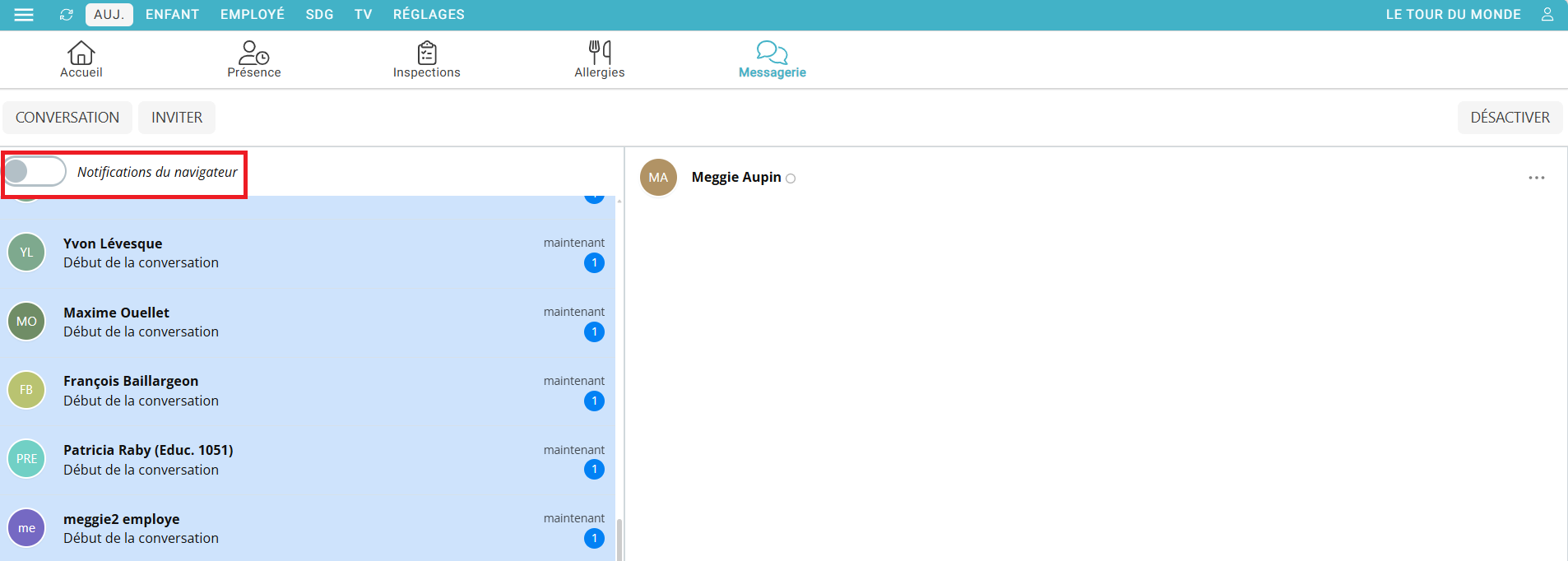 Lorsque vous êtes connecté.e depuis un navigateur web ou un appareil mobile, il vous est possible d'activer les notifications pour la messagerie (Chat).