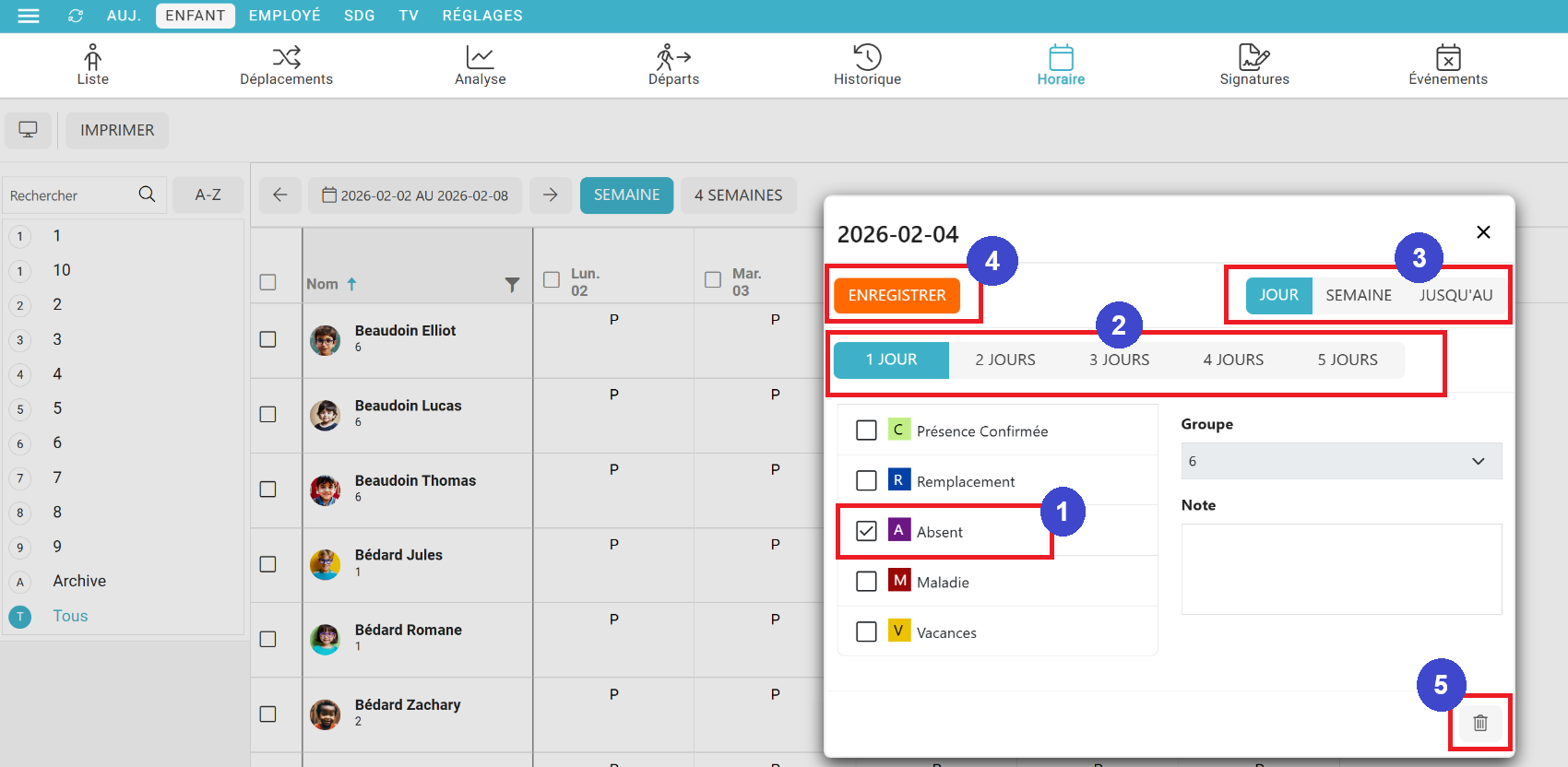 2) Vous pouvez déterminer si cette absence est pour une, deux, trois, quatre ou cinq journées.