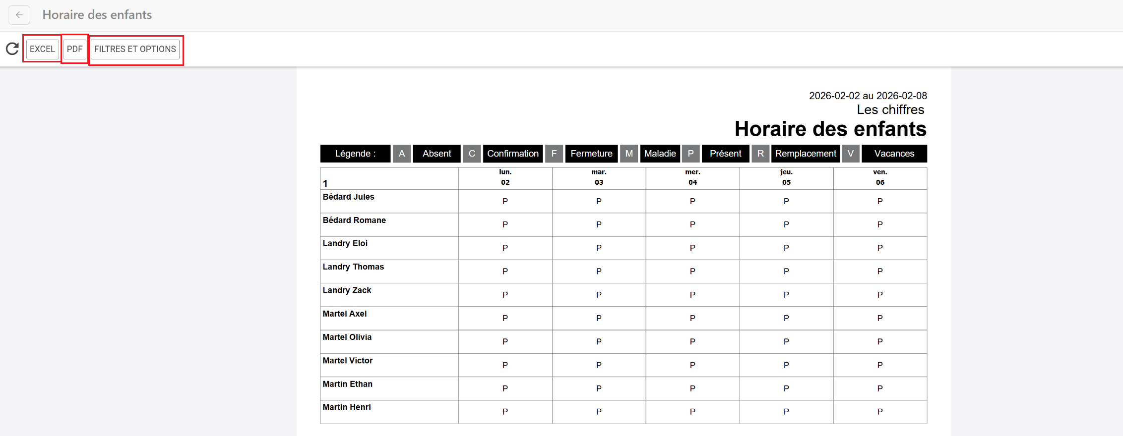 Le bouton PDF : vous permet d'exporter les données de l'horaire des enfants de la période sélectionnée dans un document PDF.
