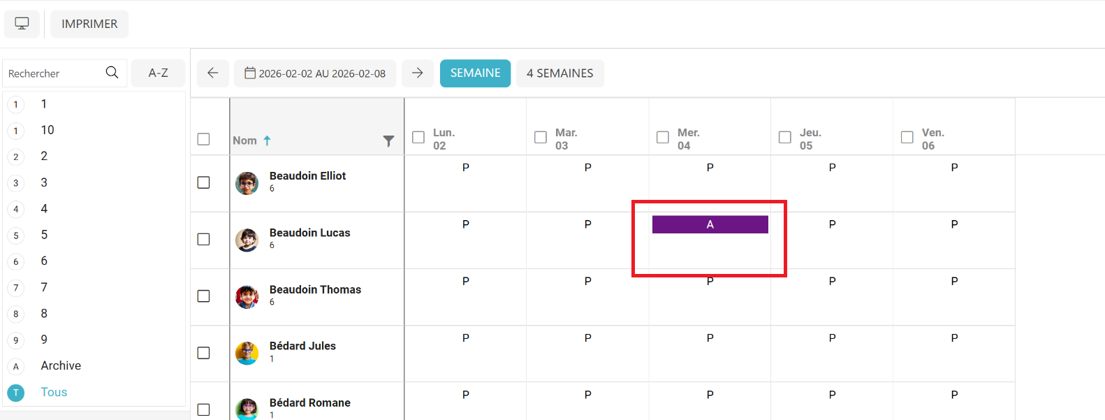 Tout d'abord, retrouvez l'enfant pour lequel vous devez ajouter une absence, retrouvez la date pour laquelle vous devez ajouter une absence et cliquez sur cette date.