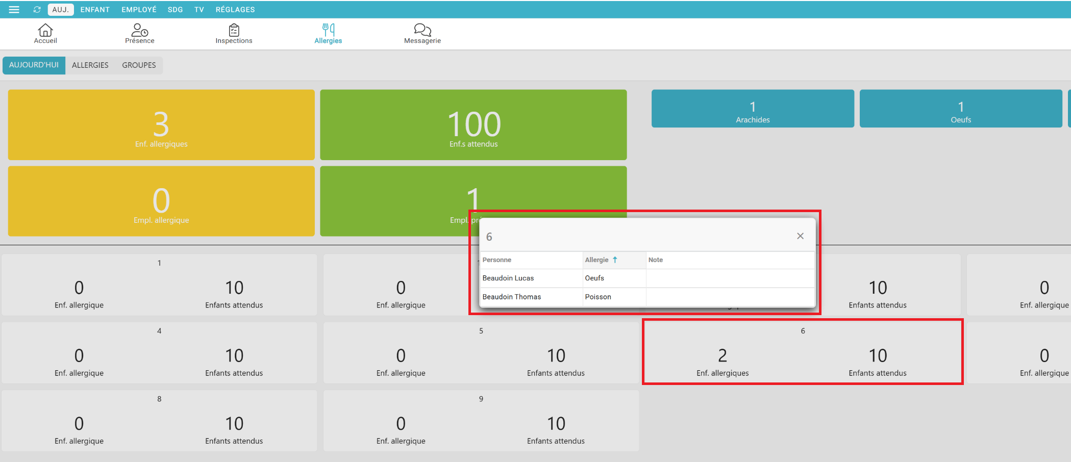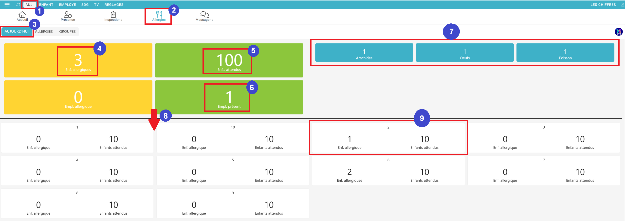 4) Enfants /Allergies - Le chiffre apparaissant dans cette boite affiche le nombre d'enfants attendus aujourd'hui ayant des allergies.