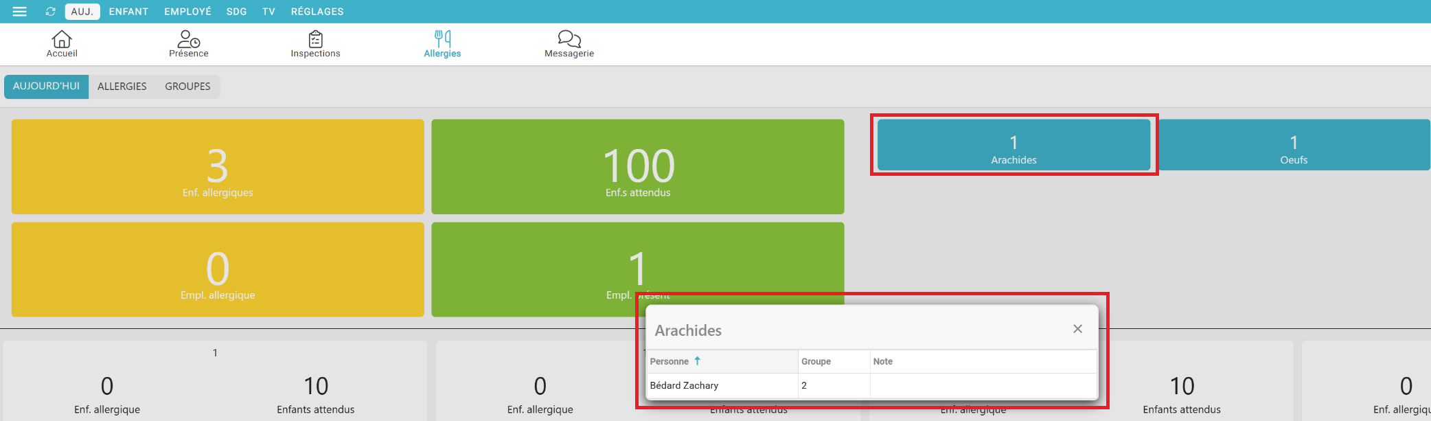 8) La section du bas affiche, pour chacun des groupes, le total des enfants attendus aujourd'hui et les enfants attendus aujourd'hui ayant des allergies.