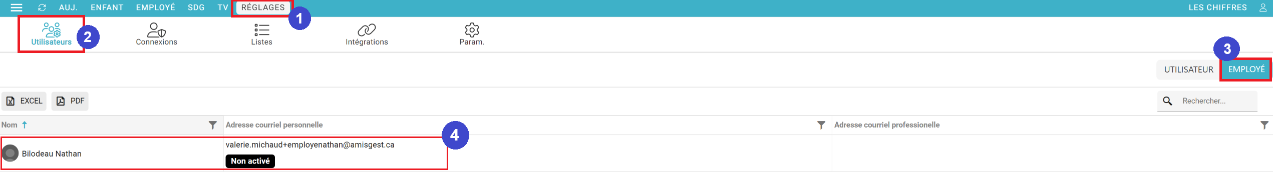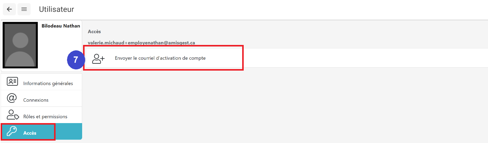 Une fois les permissions accordées, vous devrez faire parvenir un courriel d'activation à l'utilisateur via l'onglet Accès.