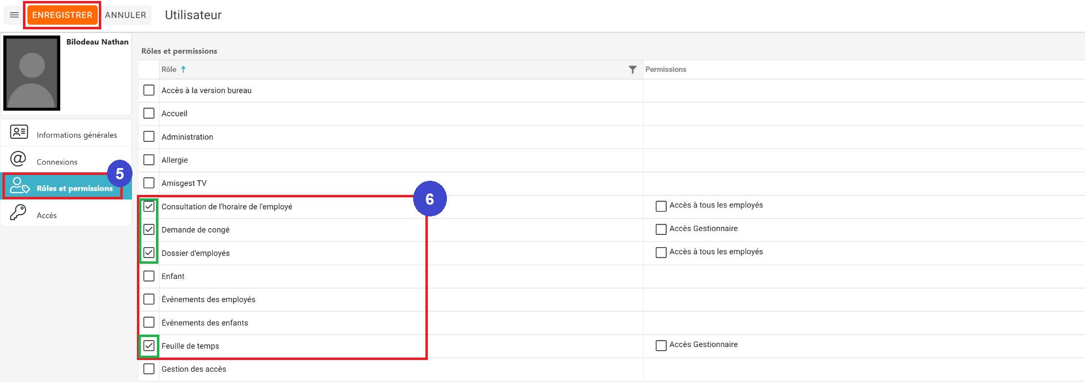 Les rôles mis en évidence (6) constituent généralement les accès donnés pour un utilisateur employé.