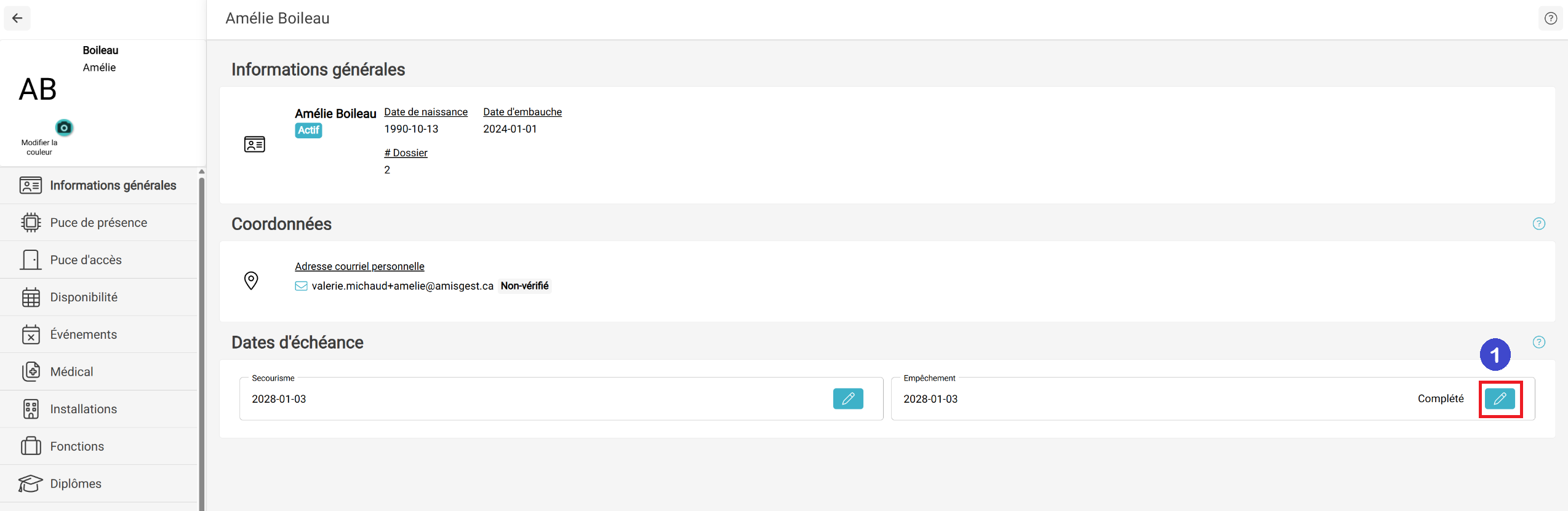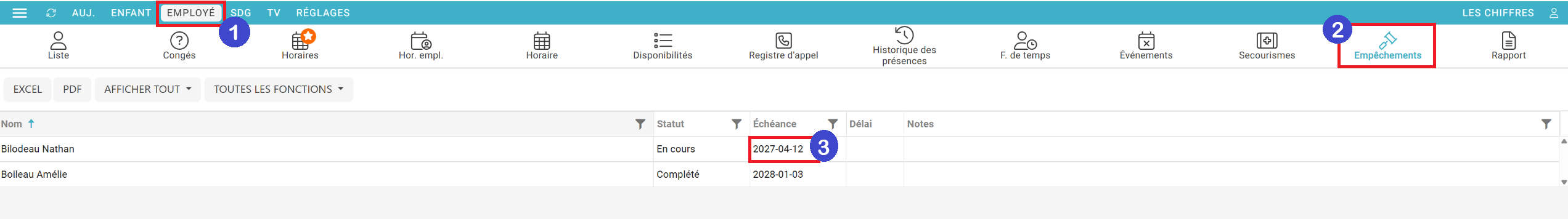 Les informations y seront à jour peu importe que vous ayez modifié de la date d'échéance par le menu Employés- Empêchements ou directement dans le dossier mobile de l'employé.