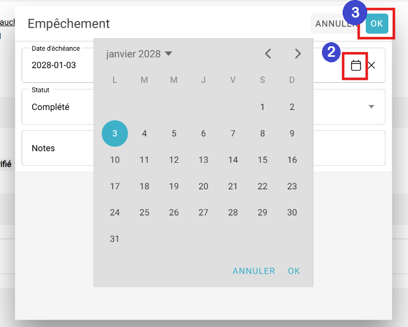 2- Cliquer sur l'icône du calendrier pour modifier la date d'échéance de l'empêchement;