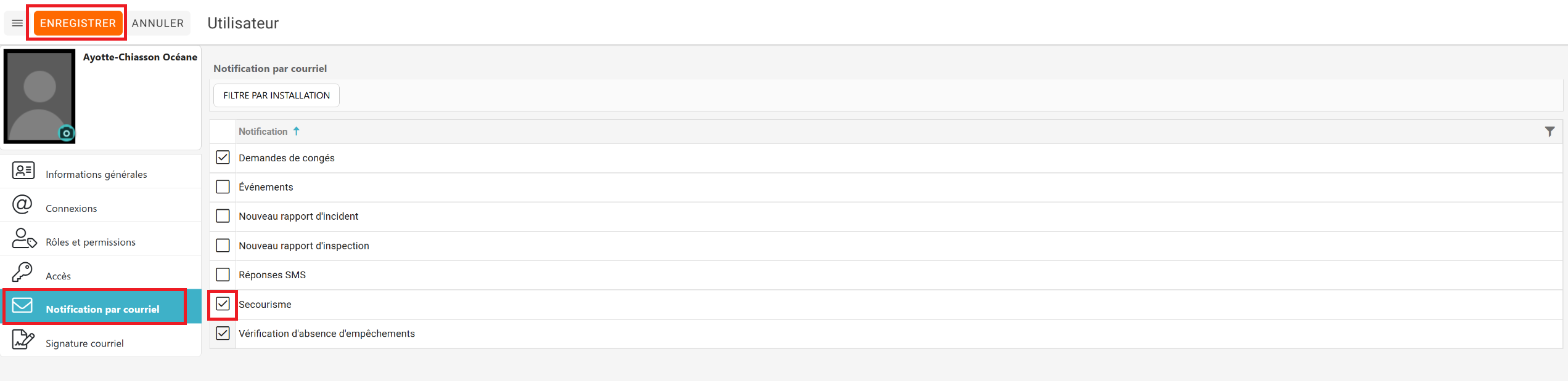 - Dans l'onglet « Notifications par courriel », assurez-vous bien de cocher la case « Secourisme » pour recevoir les alertes.