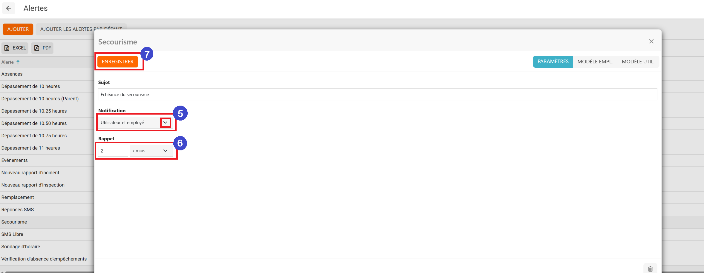 Vous pouvez ajuster les délais de rappel selon vos besoins pour les empêchements et le secourisme.