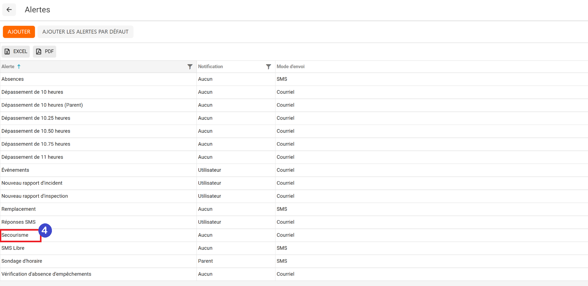 4- Dans la liste, sélectionner l'alerte souhaitée. Exemple : Secourisme