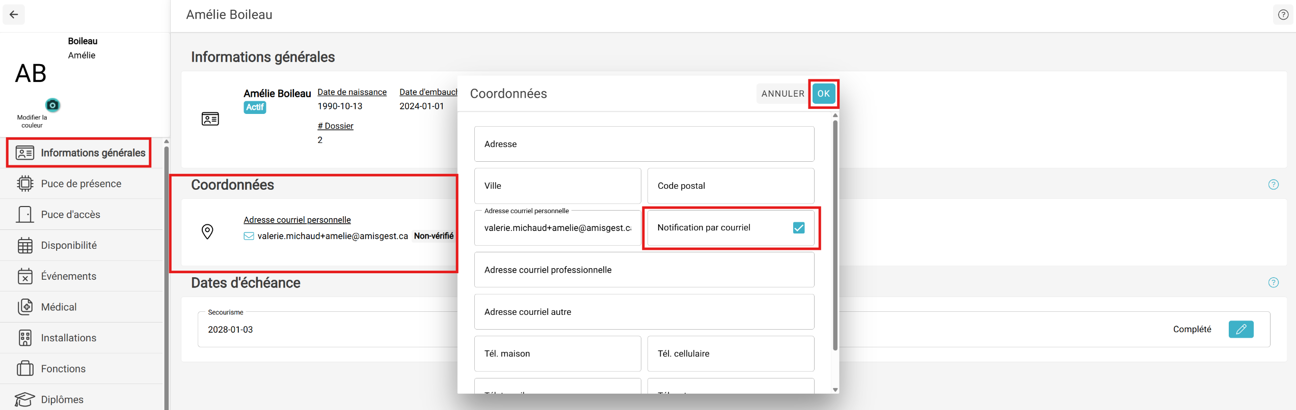 - Assurez-vous bien de cocher la case « Notifications par courriel » dans le dossier de l'employé.