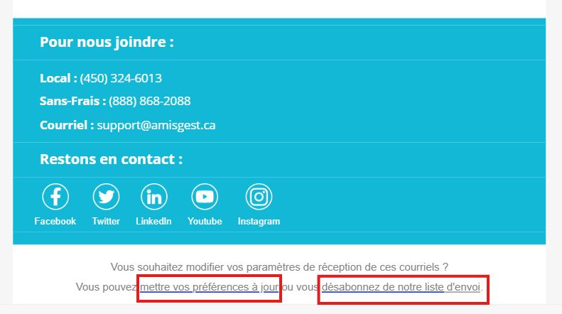 Lorsque vous recevez un courriel qui ne semble pas vous être destiné ou que vous ne souhaitez plus jamais recevoir de nos communications, il vous est possible de mettre à jour vos préférences de listes d'envoi ou de vous désabonner des listes d'envoi à même le courriel reçu, en cliquant sur "mettre vos préférences à jour" ou "vous désabonnez de notre liste d'envoi":