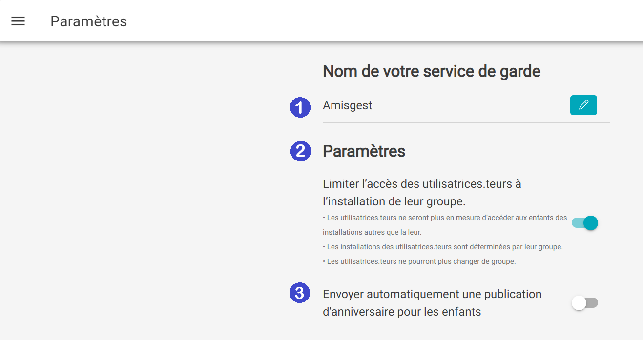 Si vous souhaitez que les éducatrices ne puissent pas consulter les journaux de bord des autres enfants des autres groupes des autres installations, vous pouvez cocher ce paramètre.