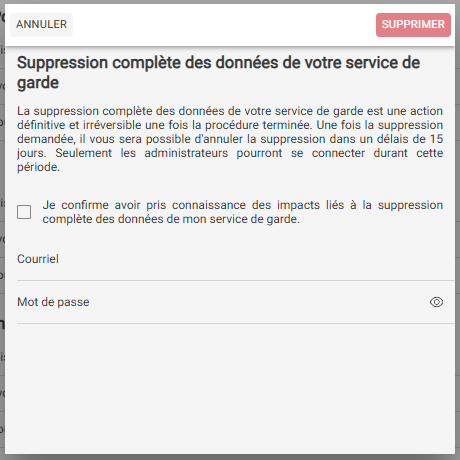- La suppression complète des données de votre service de garde est une action définitive et irréversible une fois la procédure terminée. Une fois la suppression demandée, il vous sera possible d'annuler la suppression dans un délais de 15 jours. Seulement les administrateurs pourront se connecter durant cette période.