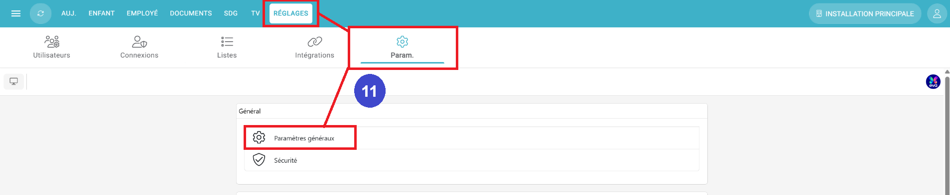 (11) Menu Réglages, puis onglet Paramètres, section Paramètres Généraux: