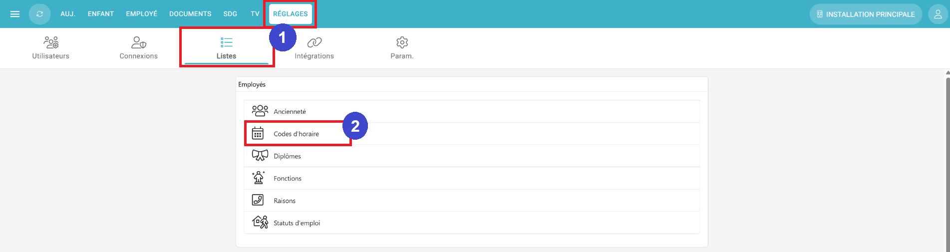 (2) Ensuite, sélectionnez le menu "Codes d'horaires" de l'encadré concernant les employés. Vous avez déjà des codes par défaut. Vous