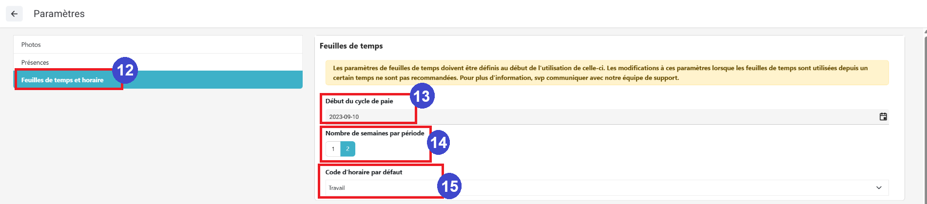(15) Indiquez le code d'horaire par défaut (souvent le code Travail ou un équivalent).