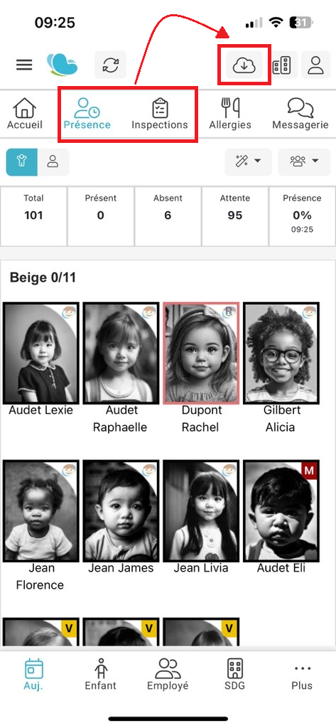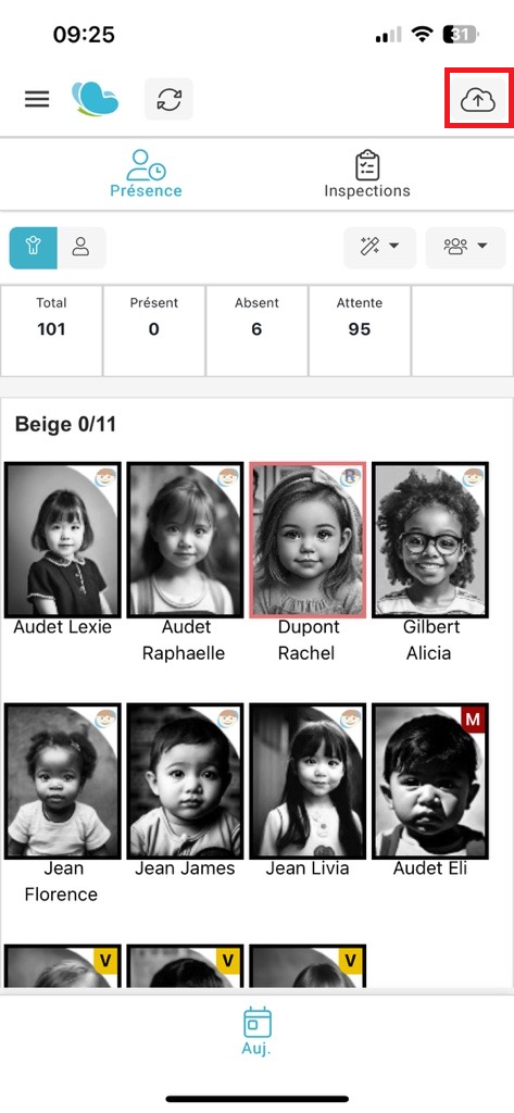 Accédez ensuite aux présences ou au menu Inspection, depuis l'onglet Auj., puis appuyez sur le nuage avec la flèche vers le bas, situé dans le coin supérieur droit de l'écran, tel que démontré ci-dessous :