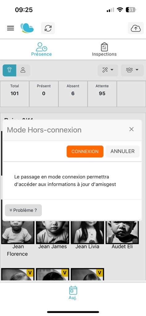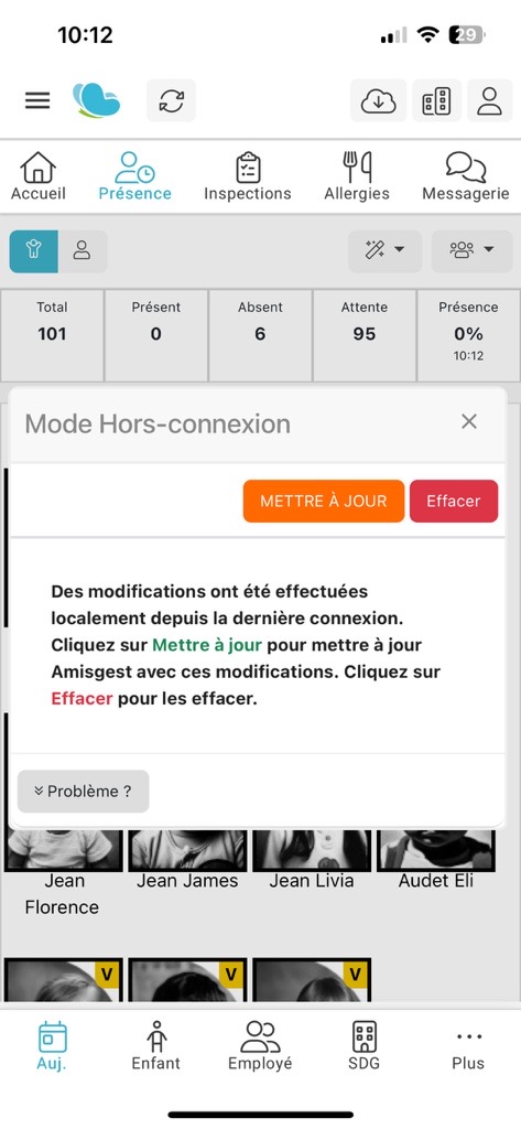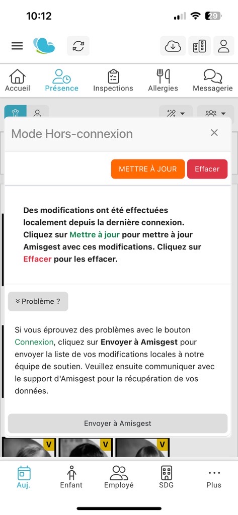 Dans le cas où un problème surviendrait (par exemple, une mauvaise connexion wi-fi) le système vous avisera et vous devrez cliquer sur le bouton "Problème?" afin de nous faire parvenir (Amisgest) les informations perdues afin que nous puissions vous les ré-intégrer dans votre application.
