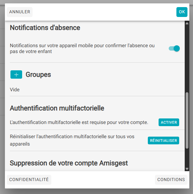 Enfin, la section Mon compte donne accès à deux documents importants : les conditions d’utilisation et la politique de confidentialité, vous permettant de consulter en tout temps les règles encadrant l’usage de l’application et la protection de vos renseignements.